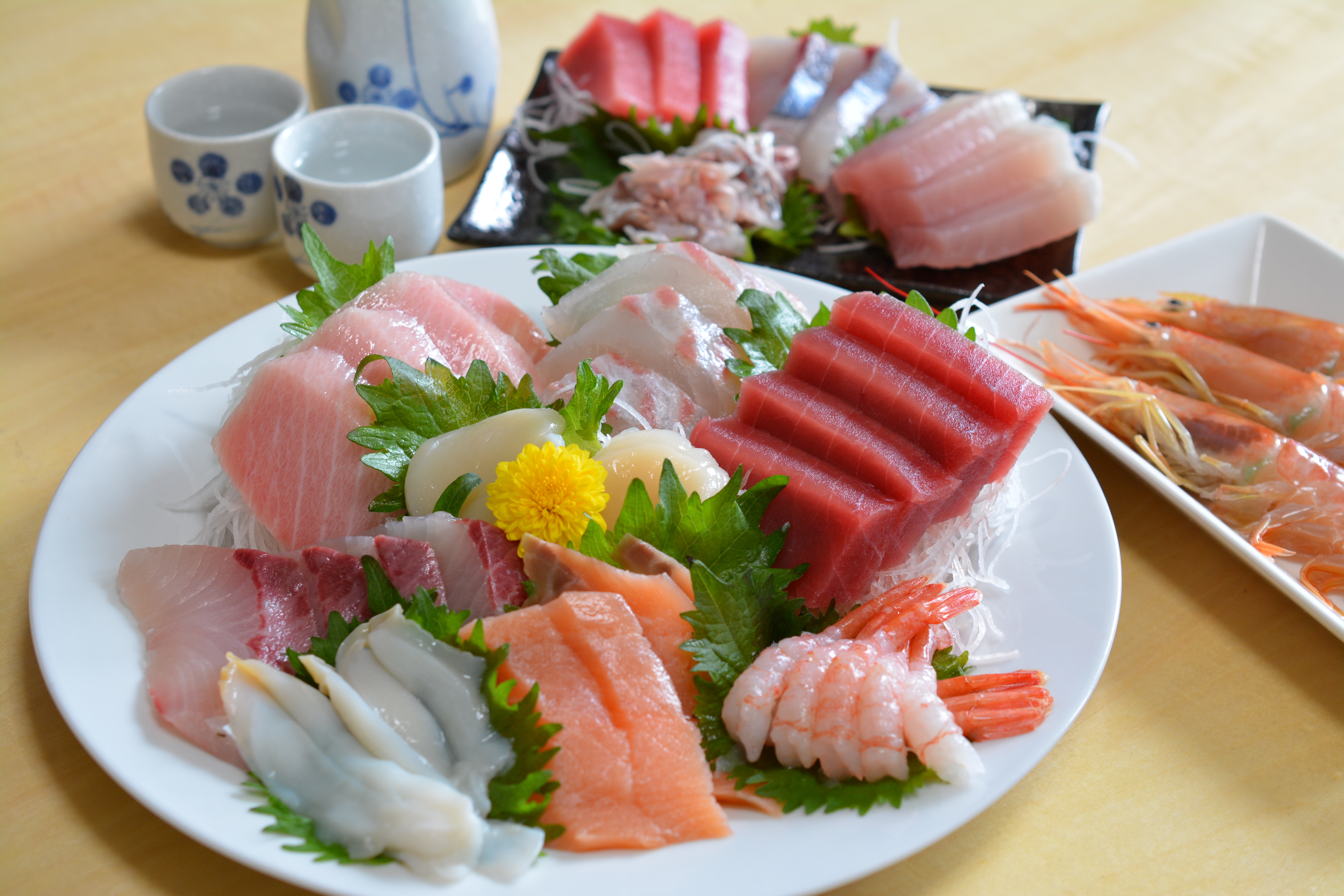 お刺し身の盛り合わせ・刺し盛り・鮮魚・お造り・お刺身の盛り合わせ・ホタテ・真鯛・サーモン・マグロ・甘エビ・甘えび・宴会・日本酒