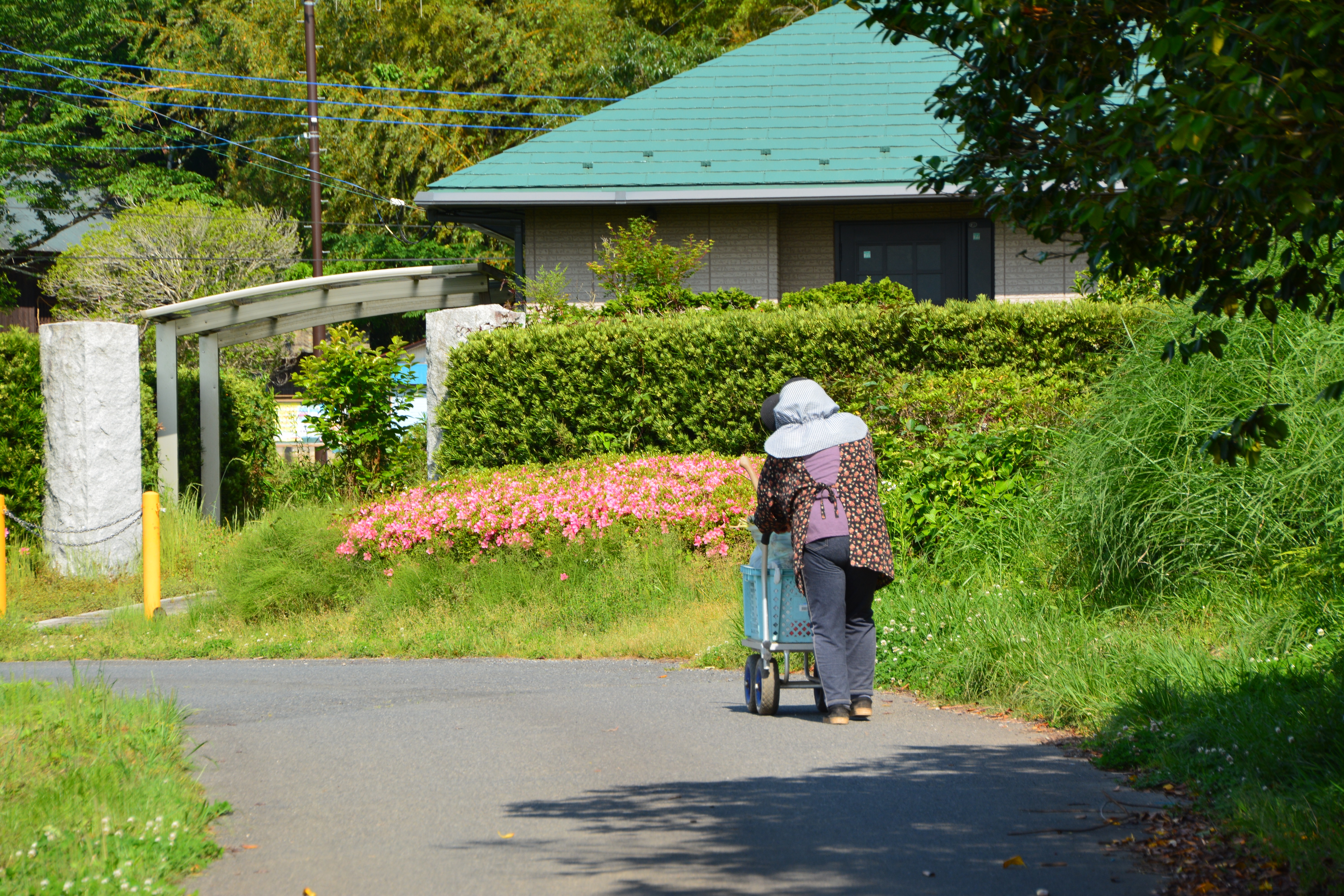 ・田舎の風景・田畑・高齢者・腰痛・足腰・骨粗鬆症・高齢化・過疎化・散歩道・祖母・実家・帰省・おばあさん・おばあちゃん・乳母車・農村・昭和ノスタルジー・ノスタルジック