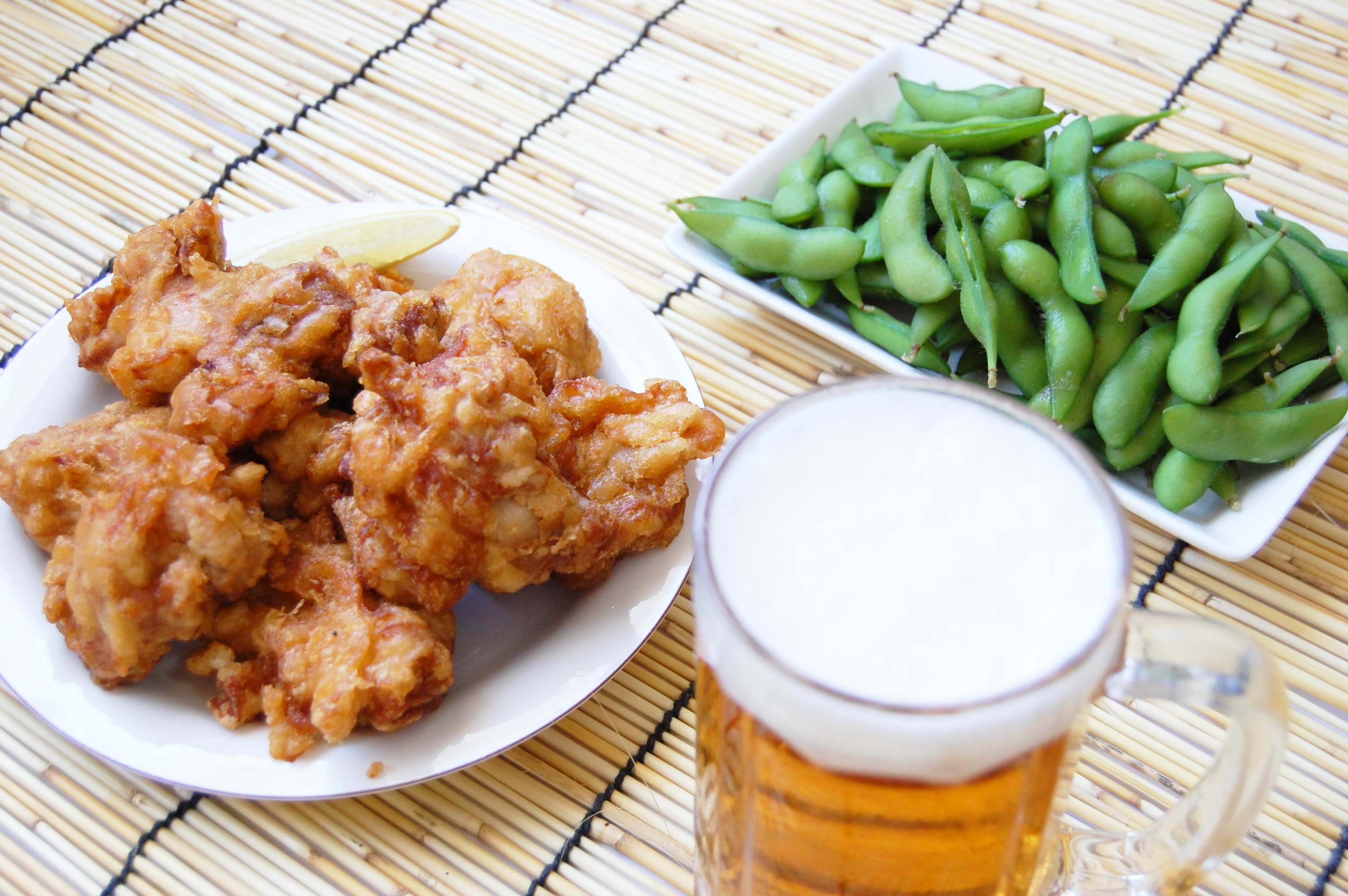 ビールジョッキ・麦酒・唐揚げ(から揚げ・からあげ)・枝豆(えだ豆)・ビアガーデン・酒の肴・生ビール