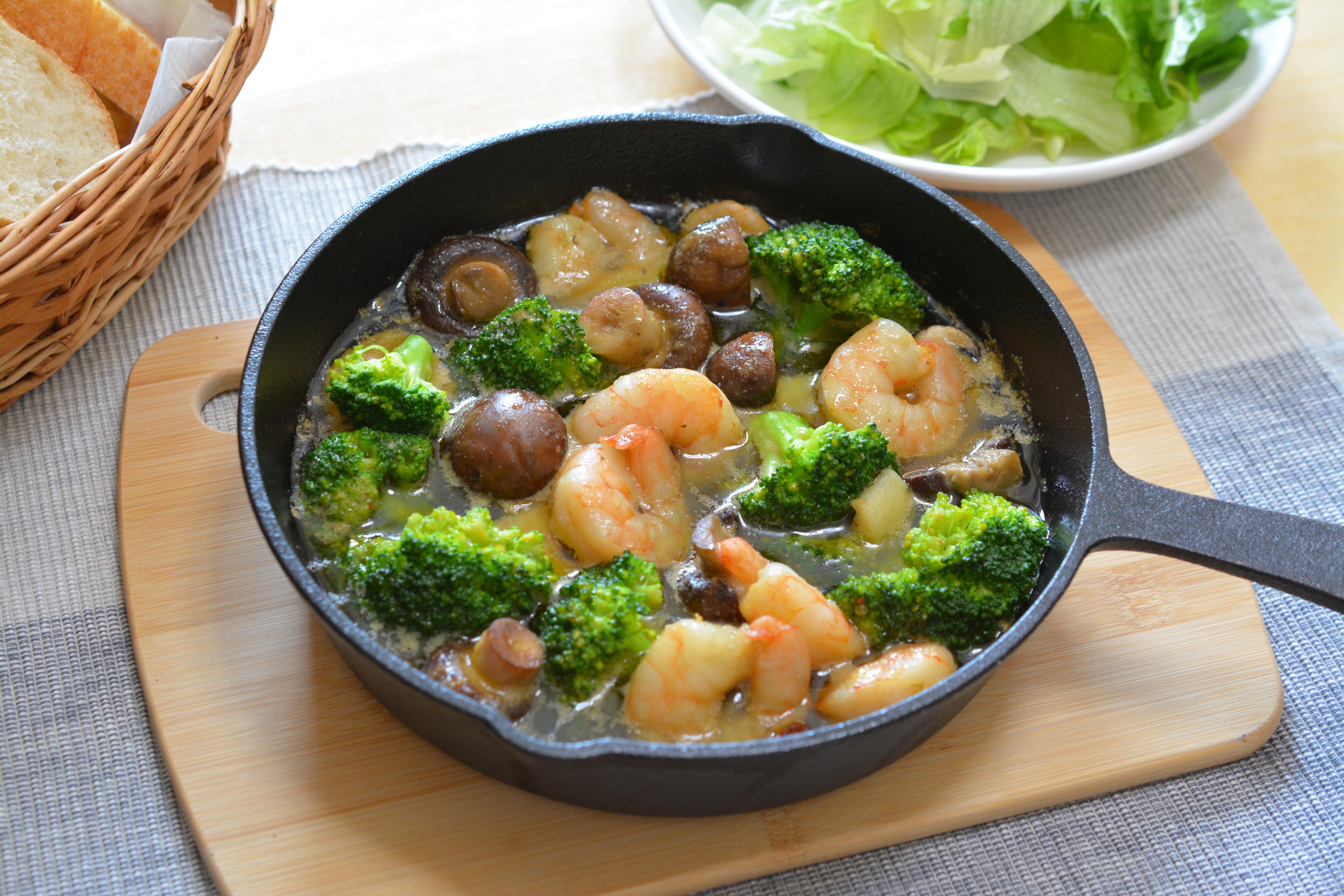 ・洋食・エビ・ブロッコリー・スキレット・鉄板・ガーリック・バジル・洋食レストラン・マッシュルーム・オリーブオイル