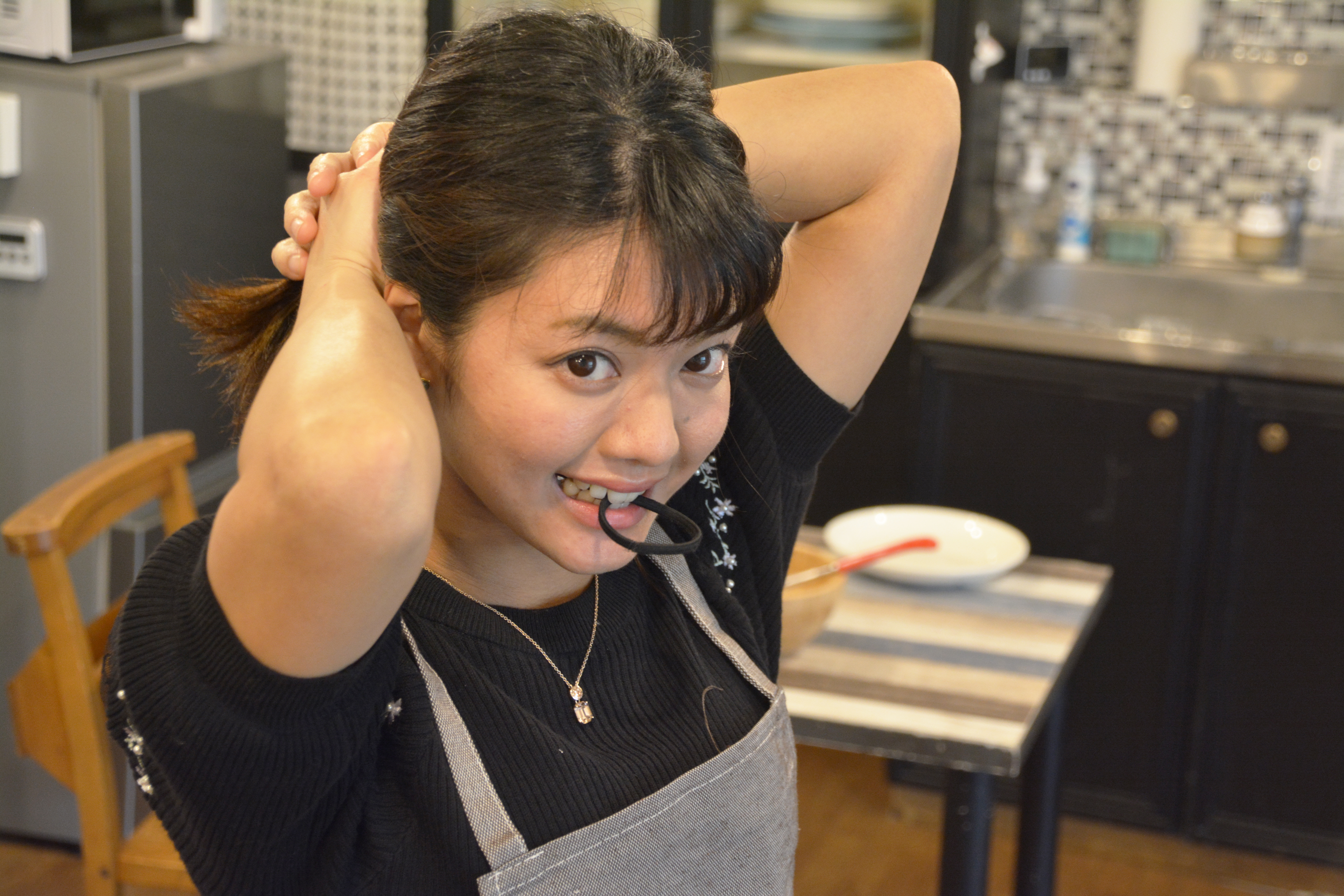 料理女子・女性・フェチ・ドキッとする仕草・あざとい上目遣い・お色気・誘惑・エロ目線・セクシーショット・エプロン・出会い系アプリ・デート・不倫・浮気・彼女