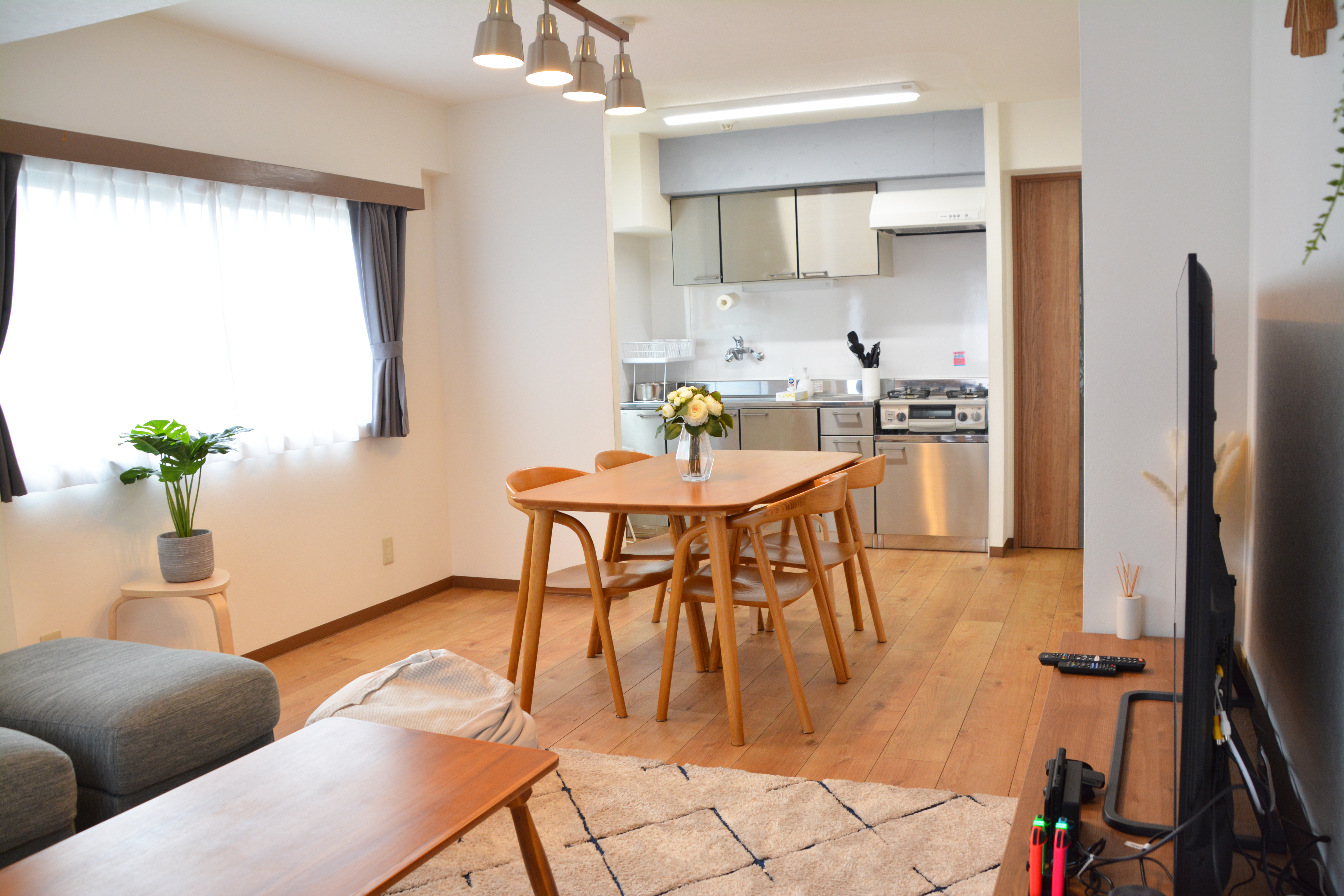 洋間・洋室・リビング・部屋・白いカーテン・インテリア空間・新婚夫婦・家族・引越し・引っ越し・テーブル・ソファー・生活・住居・居間・シェアルーム・家庭・ファミリー・小窓・カーテン・ダイニングテーブル・食卓・家具