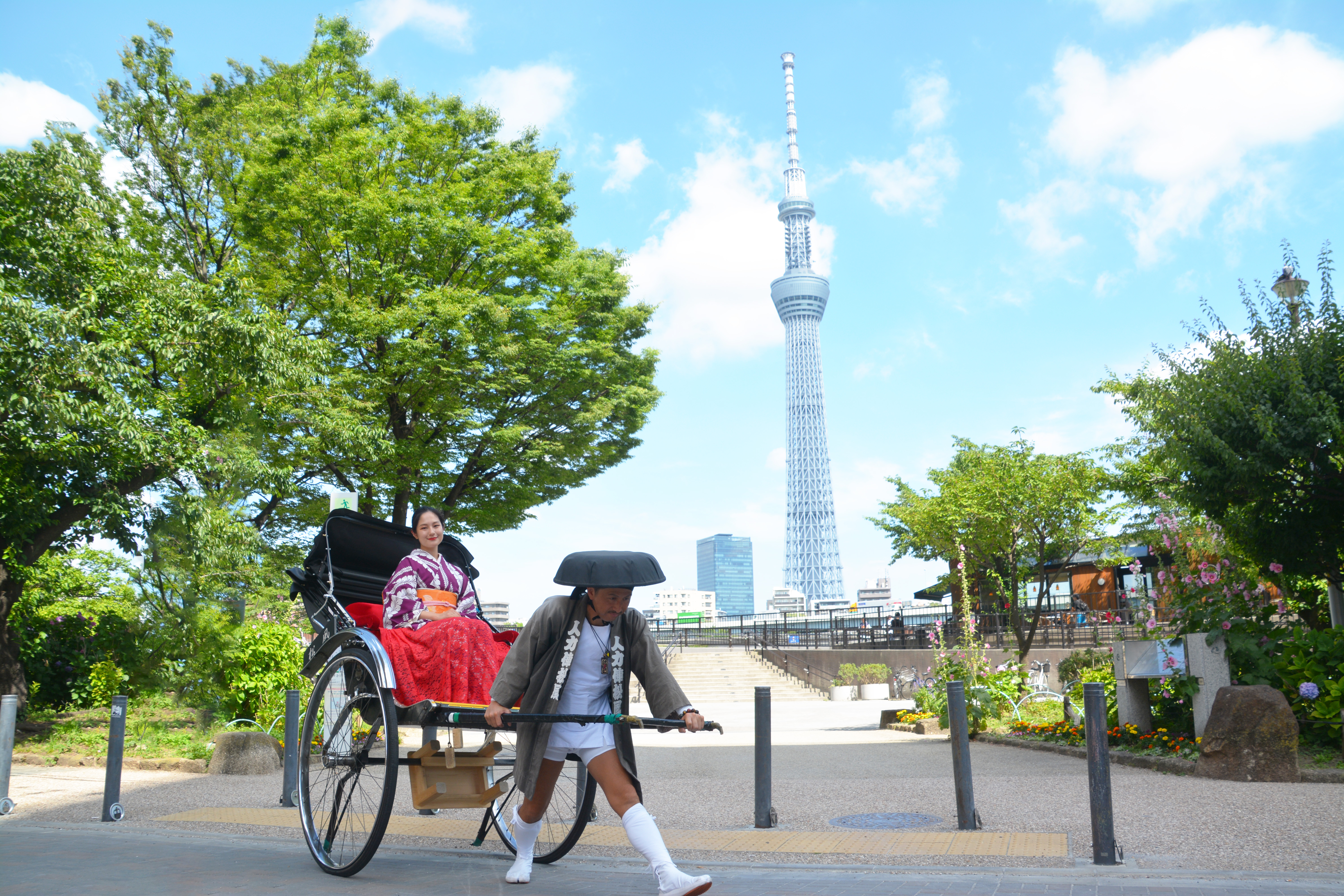 浅草、観光地、昭和レトロ、大正ロマン・笠・着物・和服・移動・スカイツリー・江戸・東京・タイムスリップ・タイムトラベル・ワープ