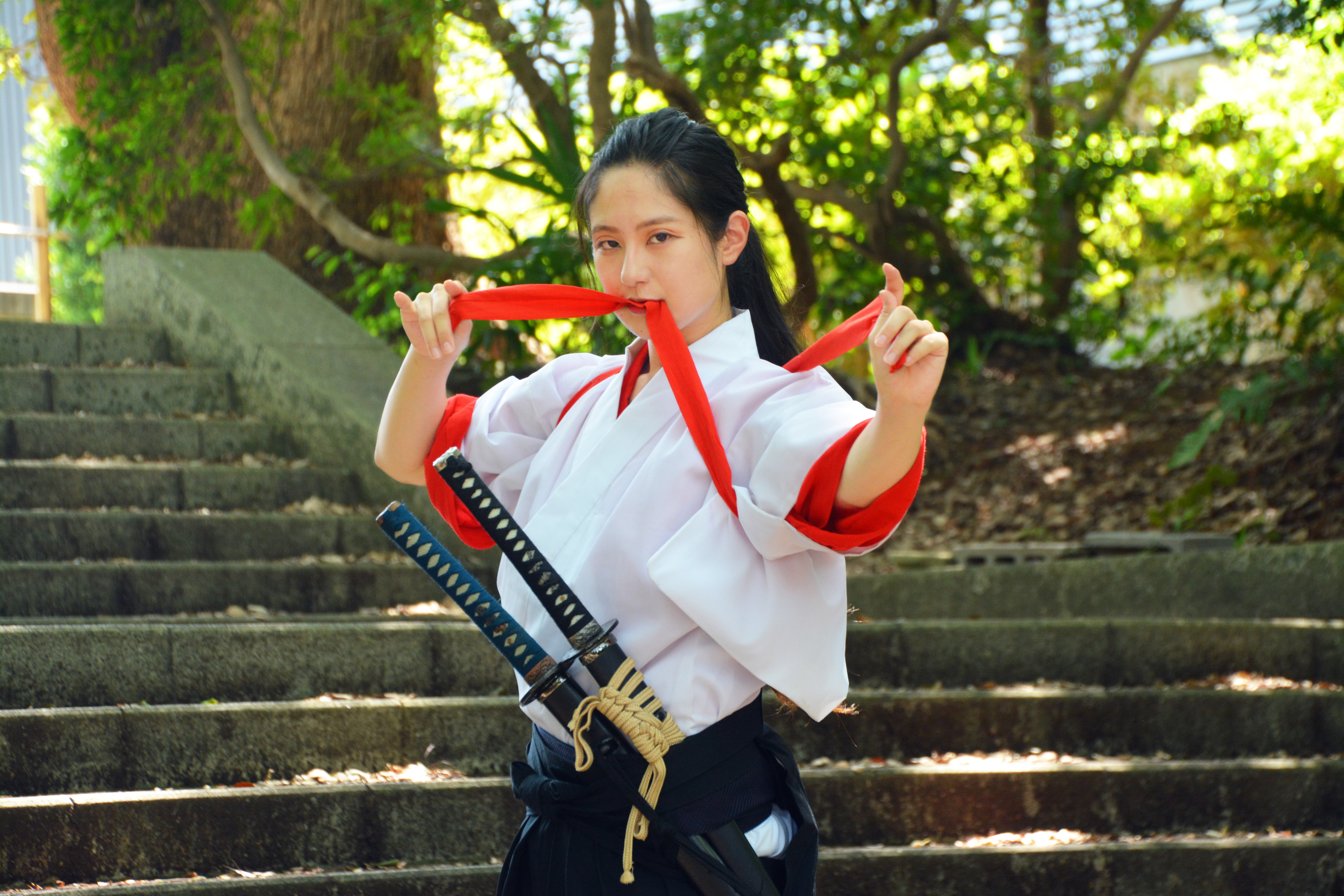 二刀流・殺陣・古武術・真剣・日本刀・女侍・和装・武士・戦闘・戦い・バトル・殺陣・殺気・侍・護身術・決戦・決闘・時代劇・剣士・精神集中・精神的・必殺技・刀・剣・着物・時代劇・たすきがけ・サムライ女