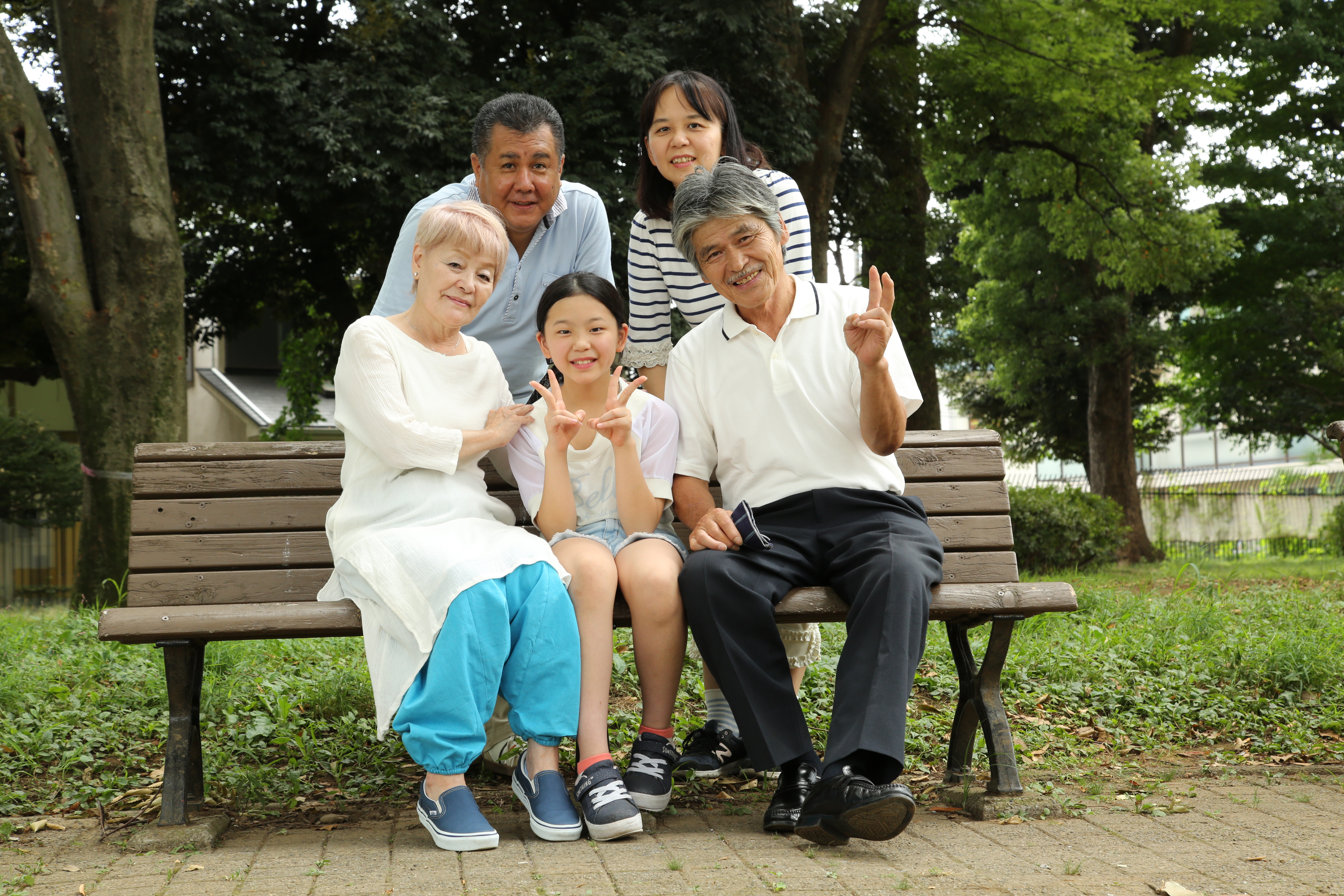 お爺ちゃん・お祖母ちゃん・祖父母・老夫婦・お母さん・お父さん・娘・子供・子ども・孫・ピース・はいチーズ・お盆・夏休み