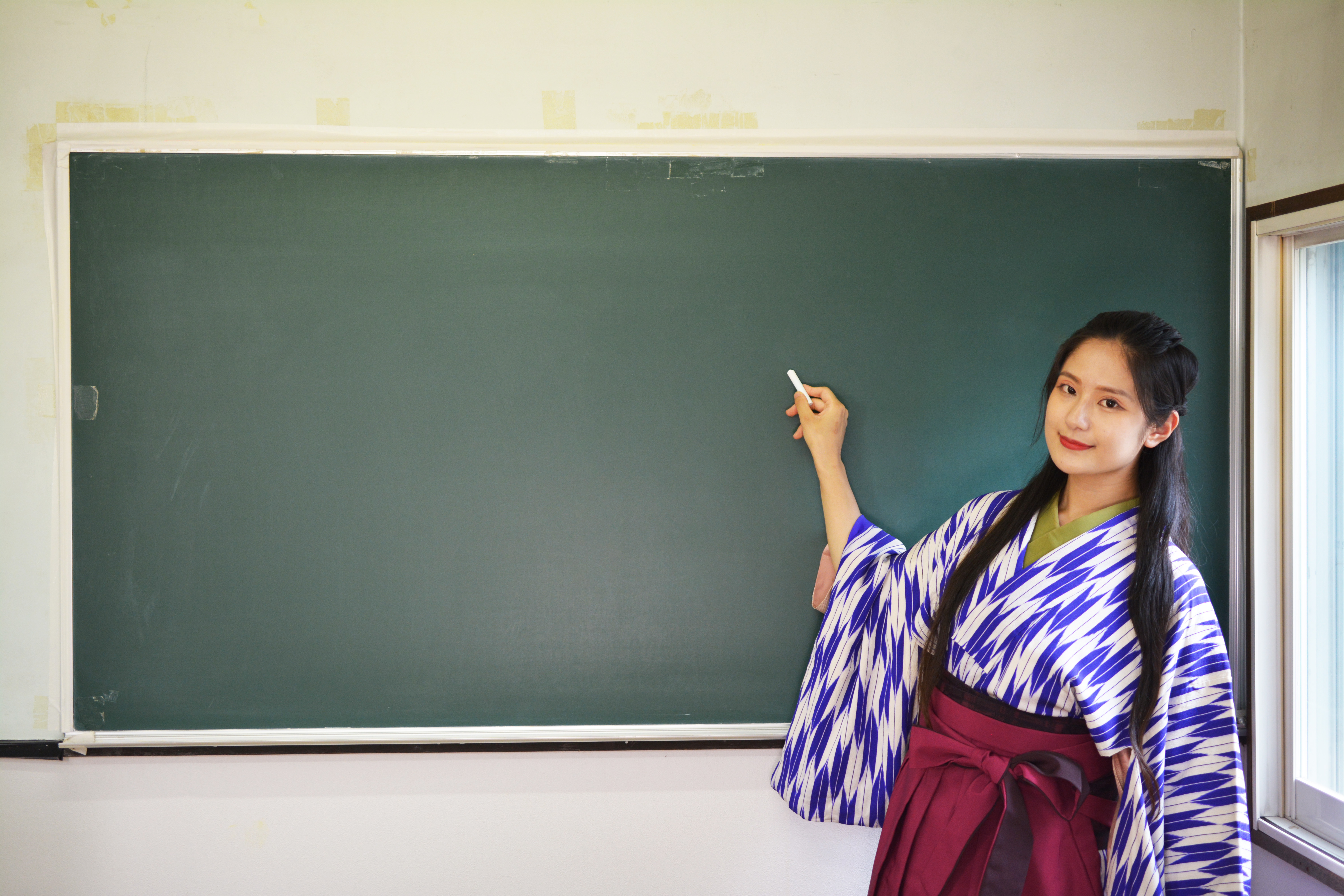 着物女学生・古典・袴姿・和服・和装・昭和レトロ・古風・勉強・学習塾・黒板・国語・古文・女教師・礼儀・マナー講座・お作法・伝統・歴史・明治・大正ロマン・先生・女子学生・塾講師・文学・小説・チョーク・黒板