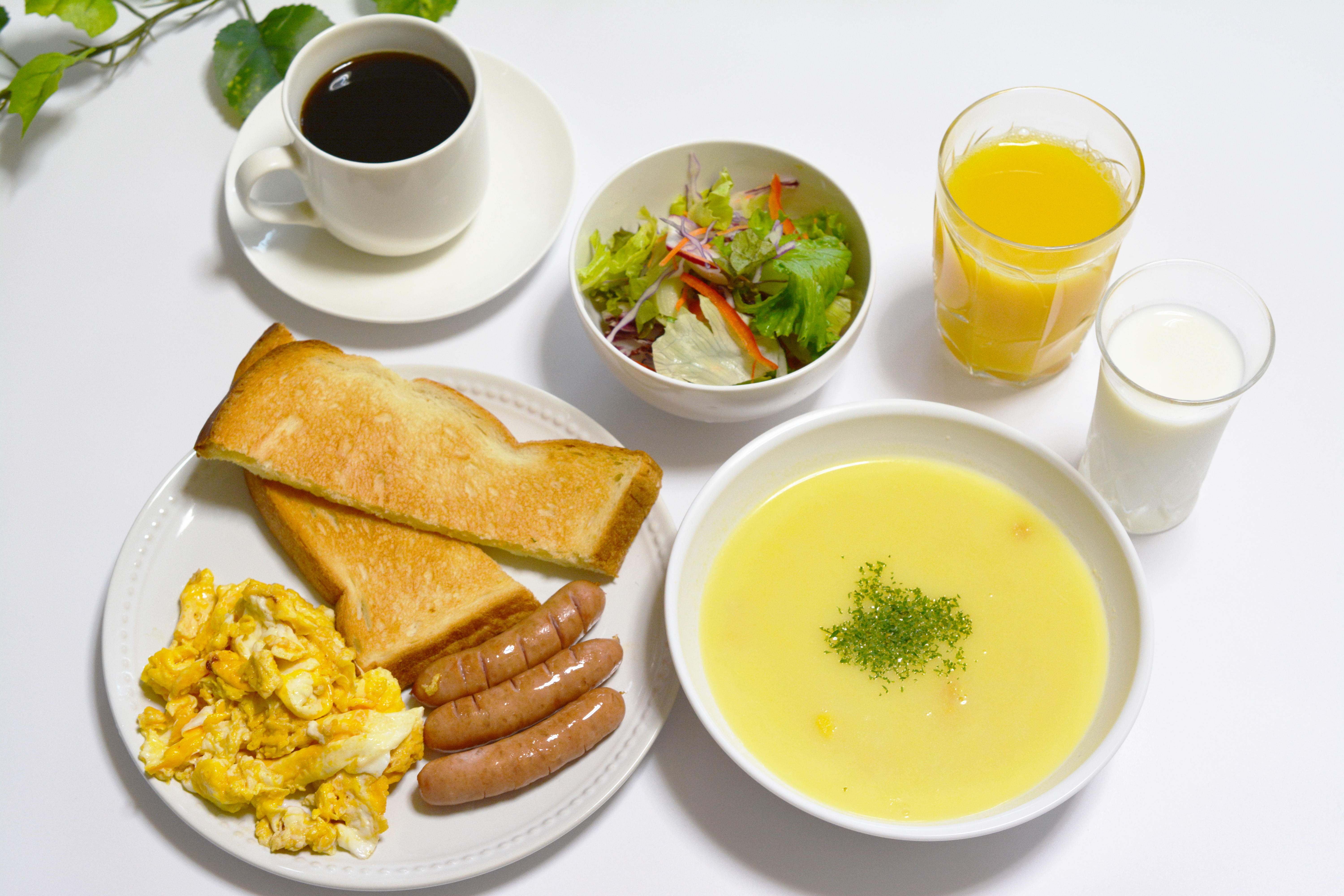 コーンポタージュ・朝食・オレンジジュース・牛乳・コーヒー・食パン・スクランブルエッグ・サラダ・ウィンナー・ソーセージ・ミルク・モーニング