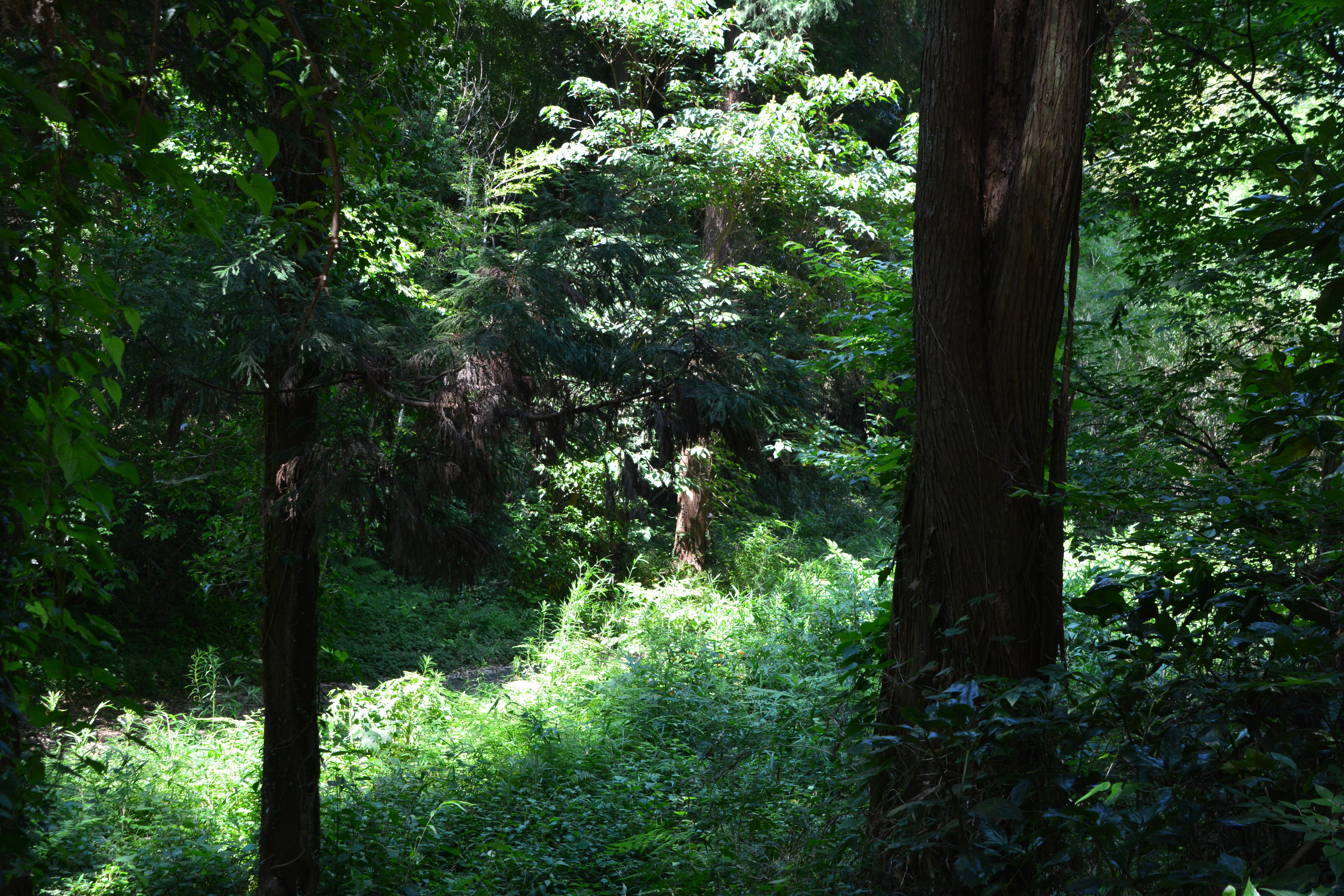 森・林・公園・森林浴、日差し・陽射し、太陽、木陰、こもれび・新緑のトンネル・初夏・山道・山林・冒険・探検・山登り