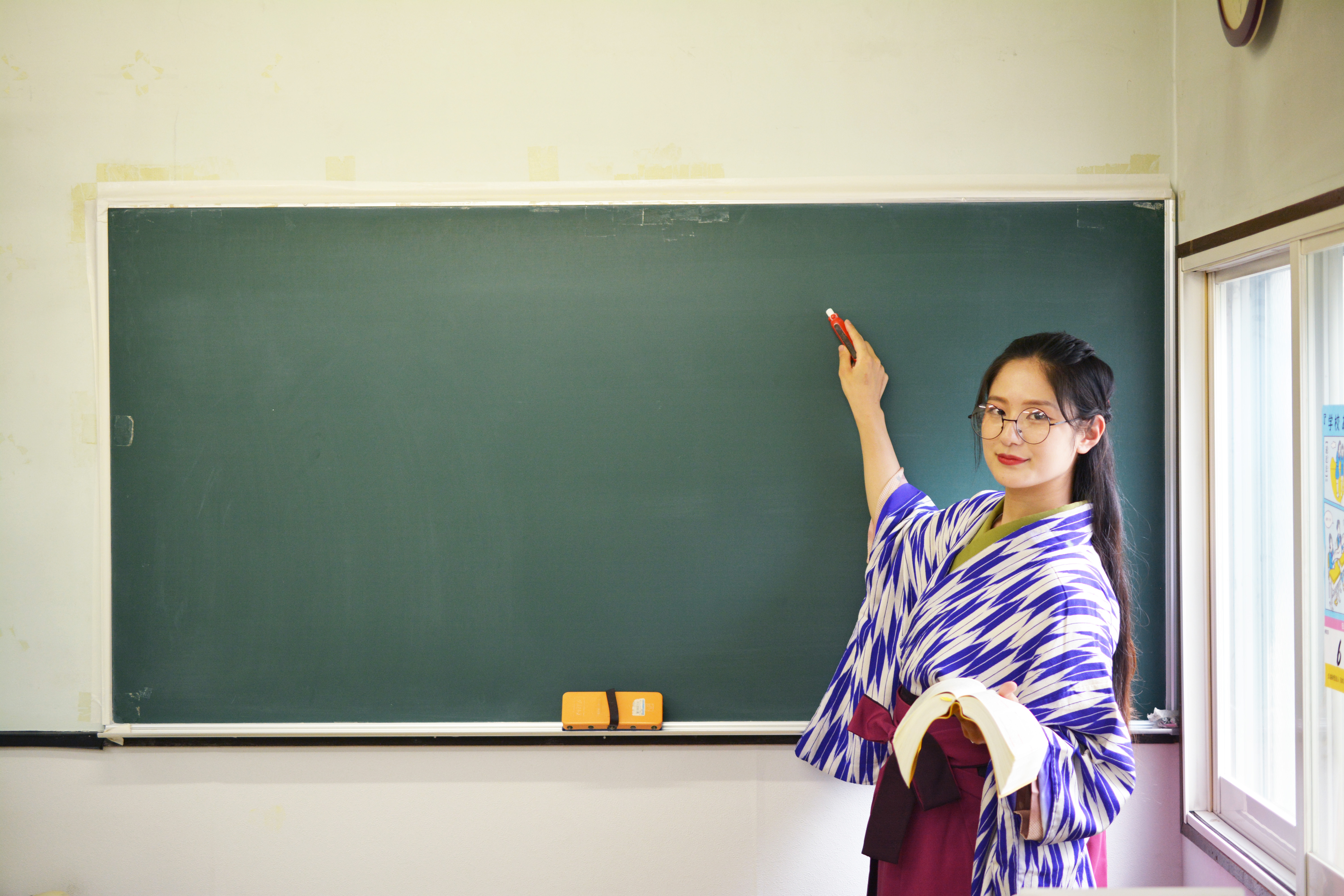 和服・和装・昭和レトロ・古風・勉強・学習塾・黒板・国語・古文・女教師・礼儀・マナー講座・お作法・伝統・歴史・明治・大正ロマン・眼鏡・先生・古典・袴姿・女子学生・塾講師・文学・小説・チョーク・黒板・丸メガネ