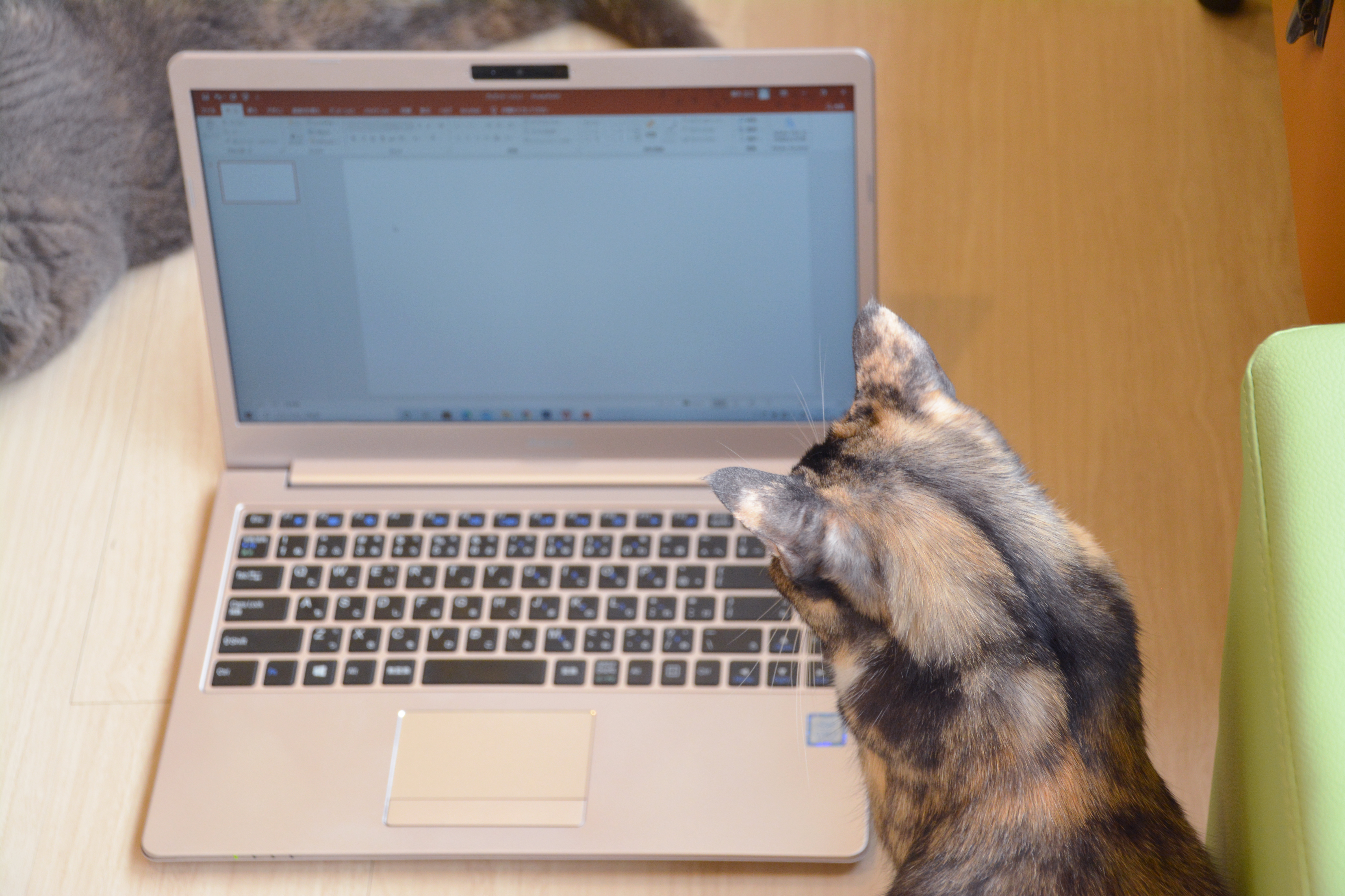 猫(ねこ)・パソコン・PC・仕事・デスクワーク・ミス・テレワーク・在宅勤務・仕事・デザイナー・バグ・エラー・不具合・故障・悪戯いたずら・後頭部・pc・文字化け・バグ・it・IT