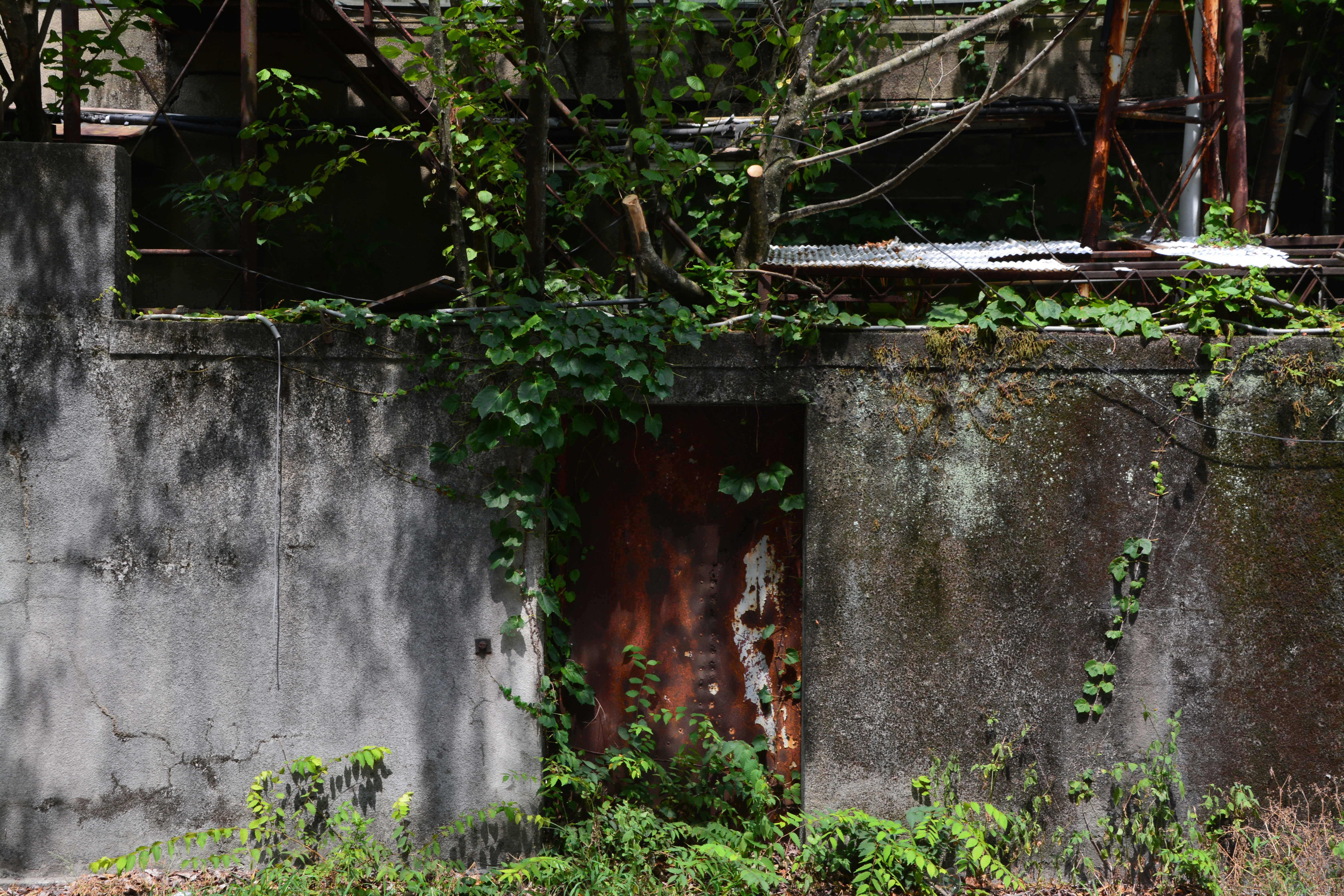 うっそうと茂る・経営破綻・金融危機・廃業・バブル崩壊・栄枯盛衰・取り壊し・廃墟・倒壊・空き家・幽霊・ホラー・お化け屋敷・オバケ・おばけ・怪談・心霊写真・心霊スポット・不法侵入・不気味・廃業・ドア・入口・出口・出入口・錆(サビ・さび)