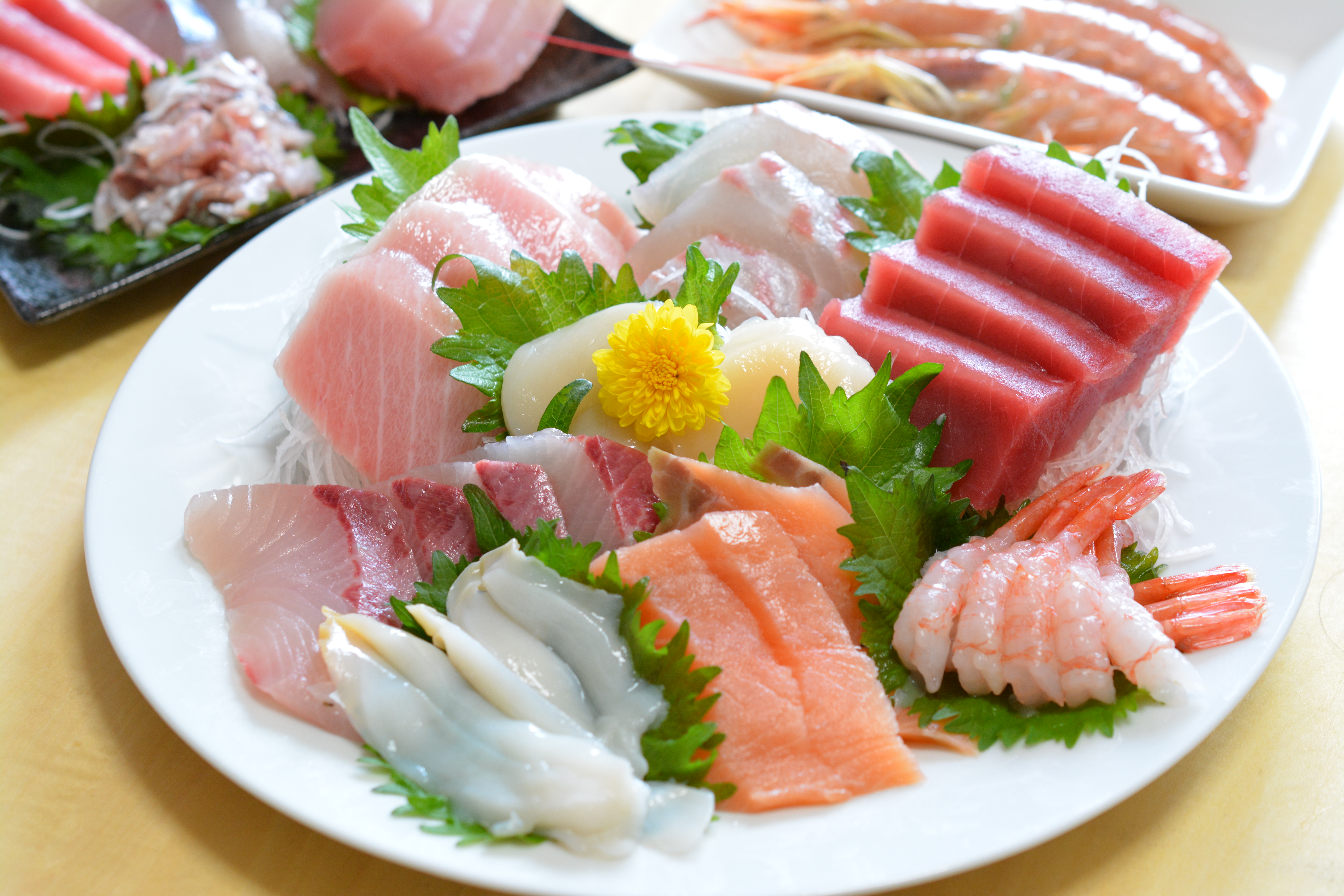 お刺し身の盛り合わせ・刺し盛り・鮮魚・お造り・お刺身の盛り合わせ・ホタテ・真鯛・サーモン・マグロ・甘エビ・甘えび