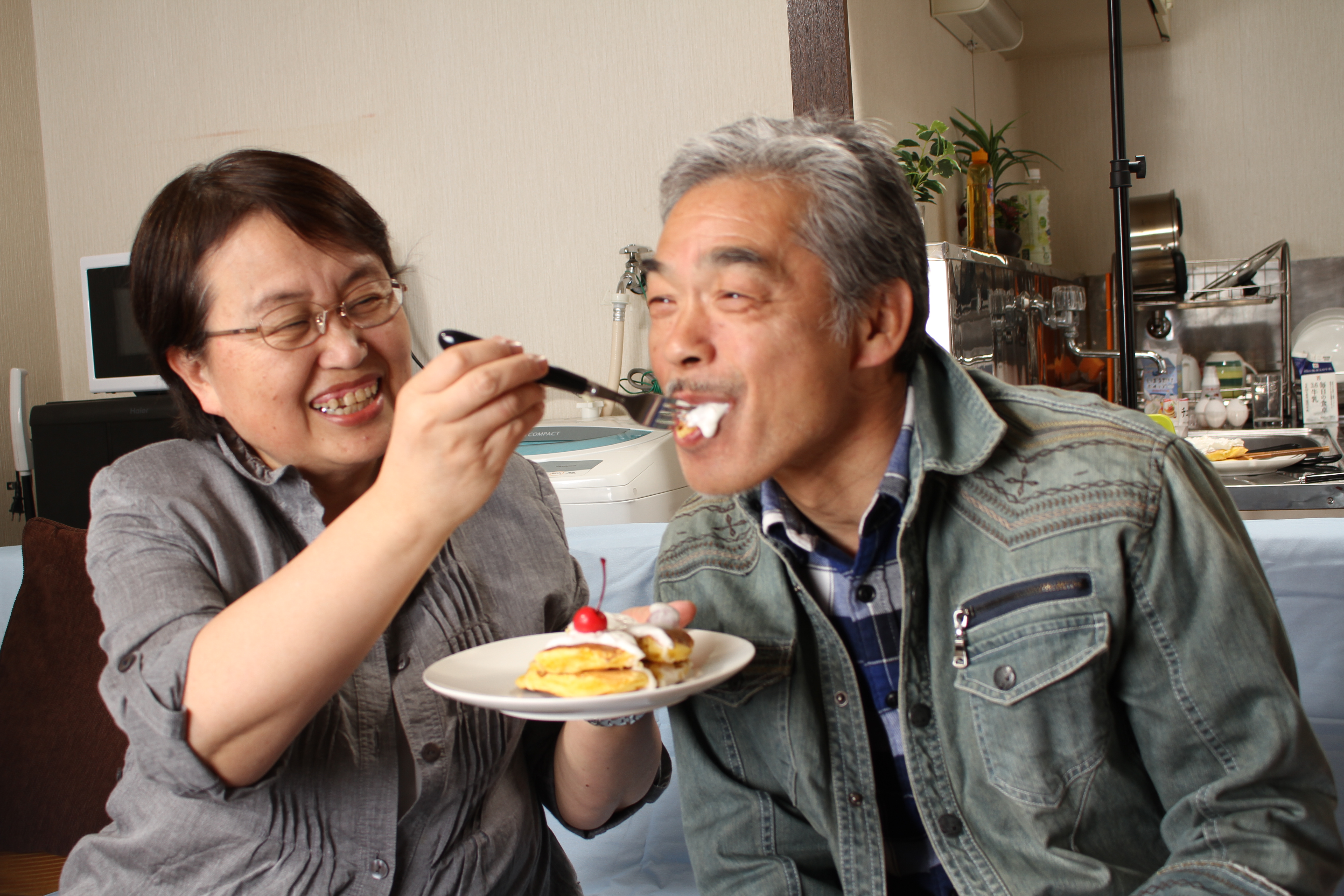 ラブラブなカップル、仲良しな熟年夫婦、仲直り、結婚式でよくある光景、スイーツを美味しそうに食べるおっさん、パンケーキ・美味しい