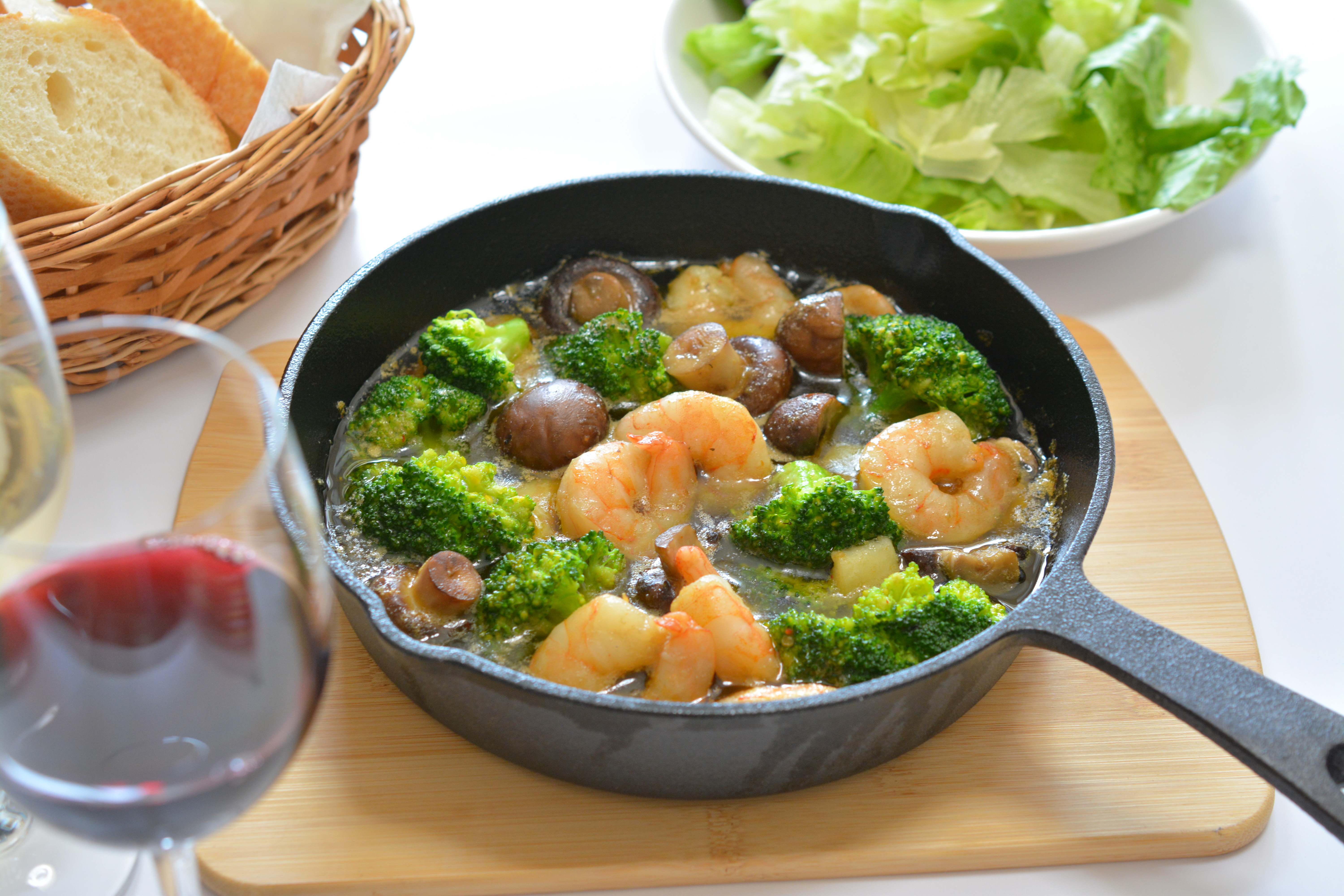 フランスパン・バゲット・洋食・エビ・ブロッコリー・スキレット・鉄板・ガーリック・オリーブオイル