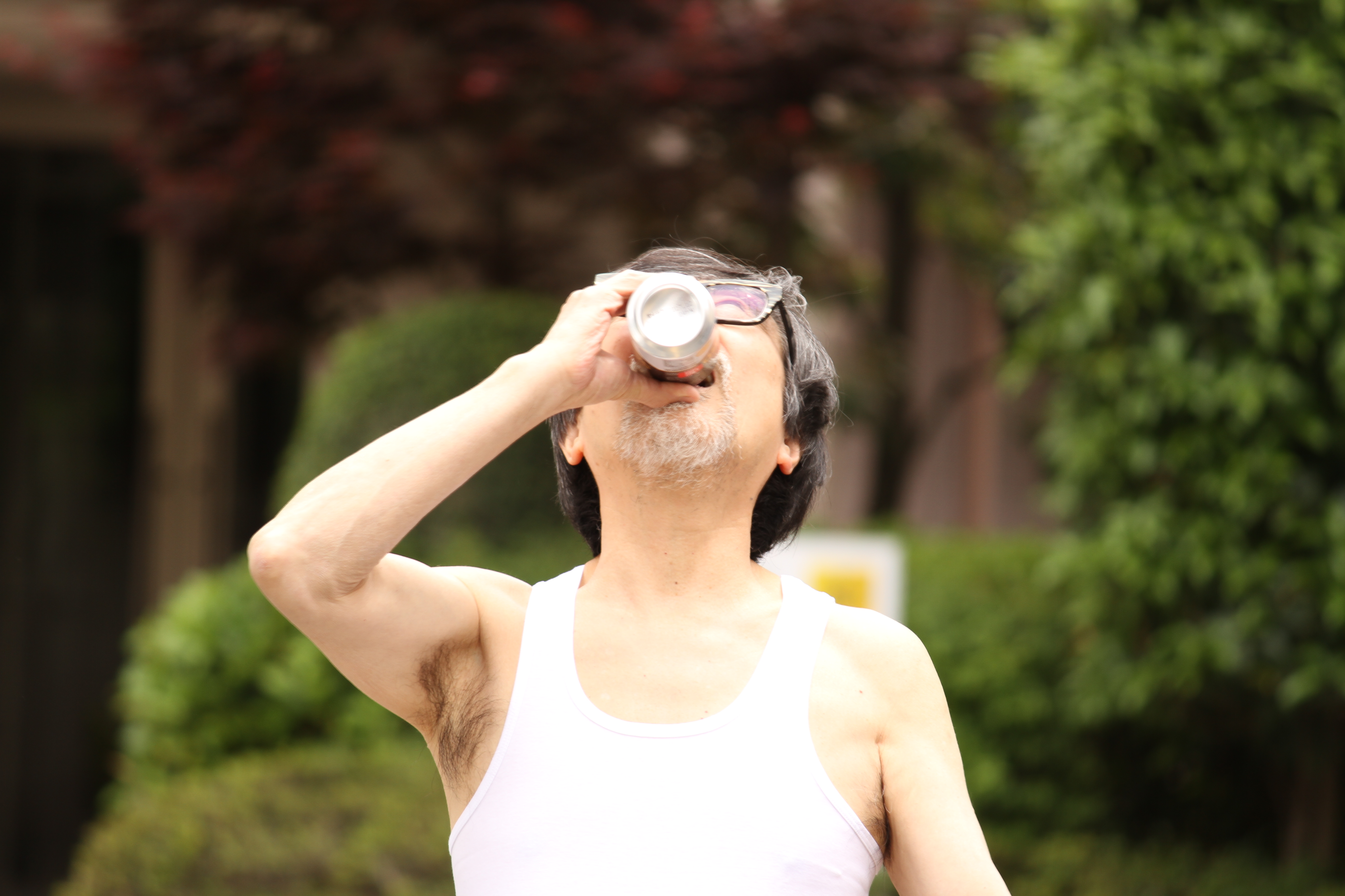 シニア・中高年・老人・散歩・タンクトップ・宴会・酔っ払い・腹巻き・ハラマキ・昼寝・泥酔・一人暮らし・おっさん・空き缶・ビール・アルコール・酒癖・酒グセ