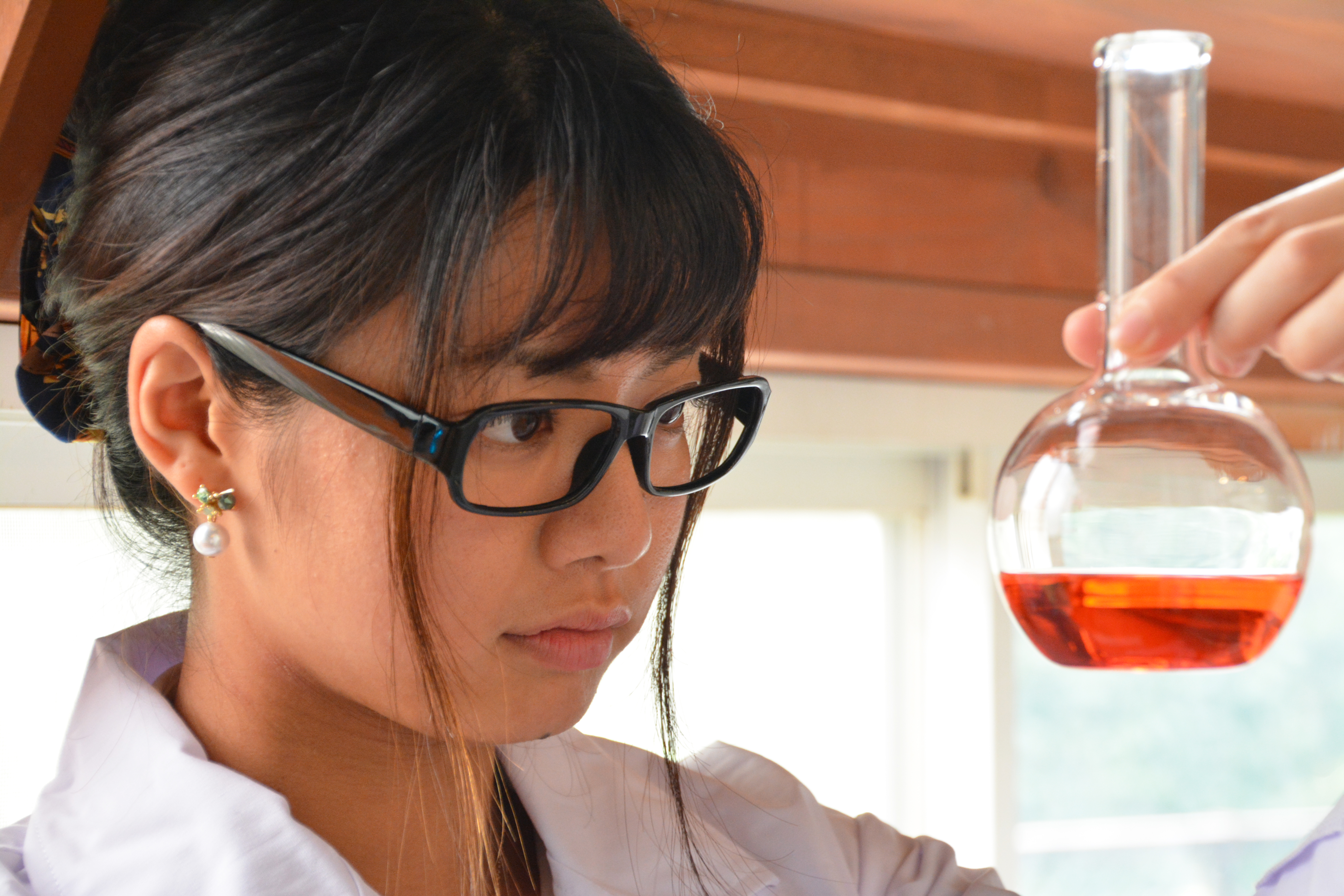 大学生・女子大生・理科実験・試験管・液体・不純物チェック・新薬開発・基礎研究・研究開発・研究室・ラボ・新型ウィルス・免疫細胞・ワクチン・医薬品・医療・勉強・試験・科学・化学・生命・微生物・嬉々とした表情・楽しい・眼鏡女子・メガネ女子・サイエンス・フラスコ・ビーカー・白衣・リケ女・医学部・薬学部・コロナウィルス