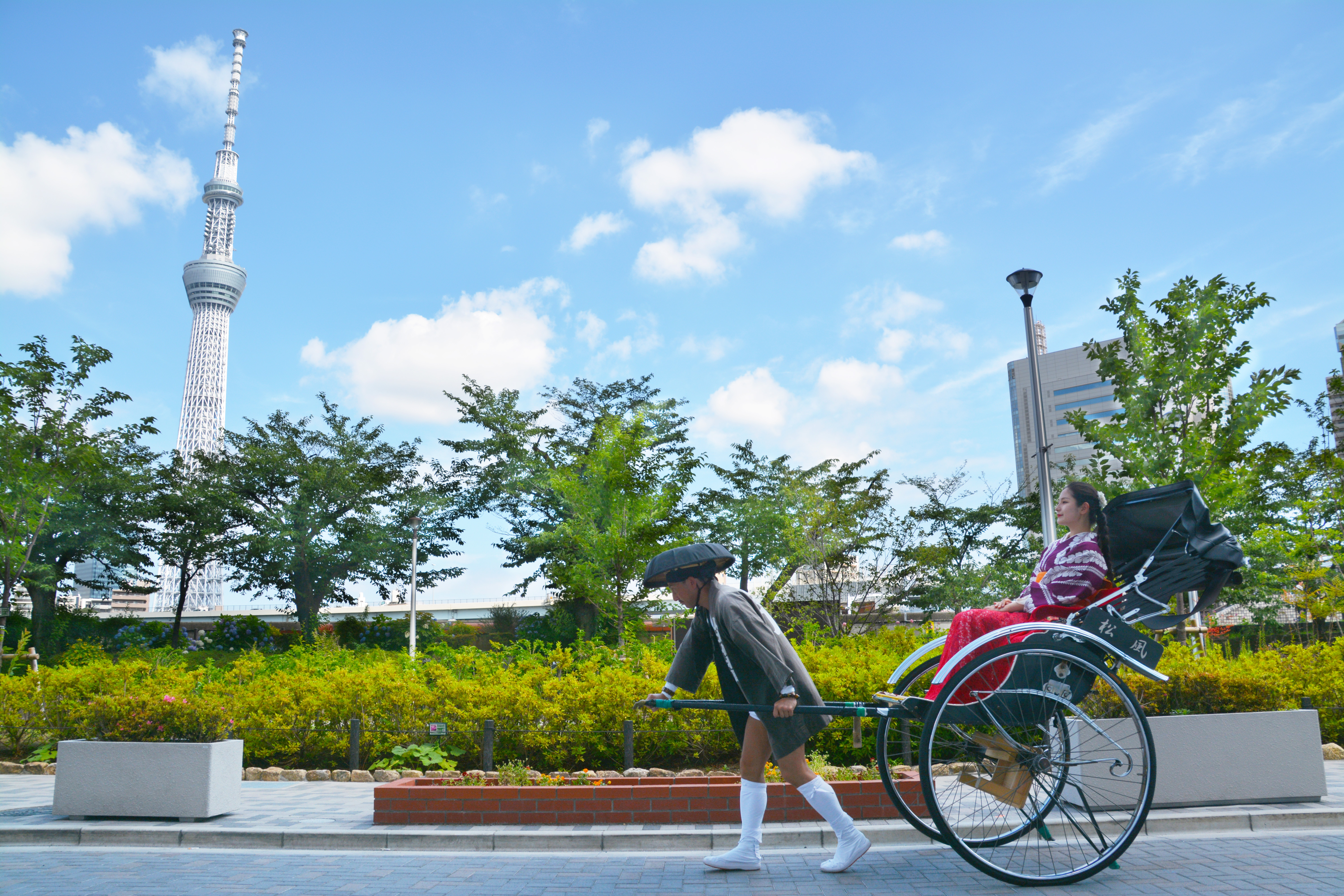 浅草、観光地、昭和レトロ、大正ロマン・笠・着物・和服・移動・スカイツリー・江戸・東京・タイムスリップ・タイムトラベル