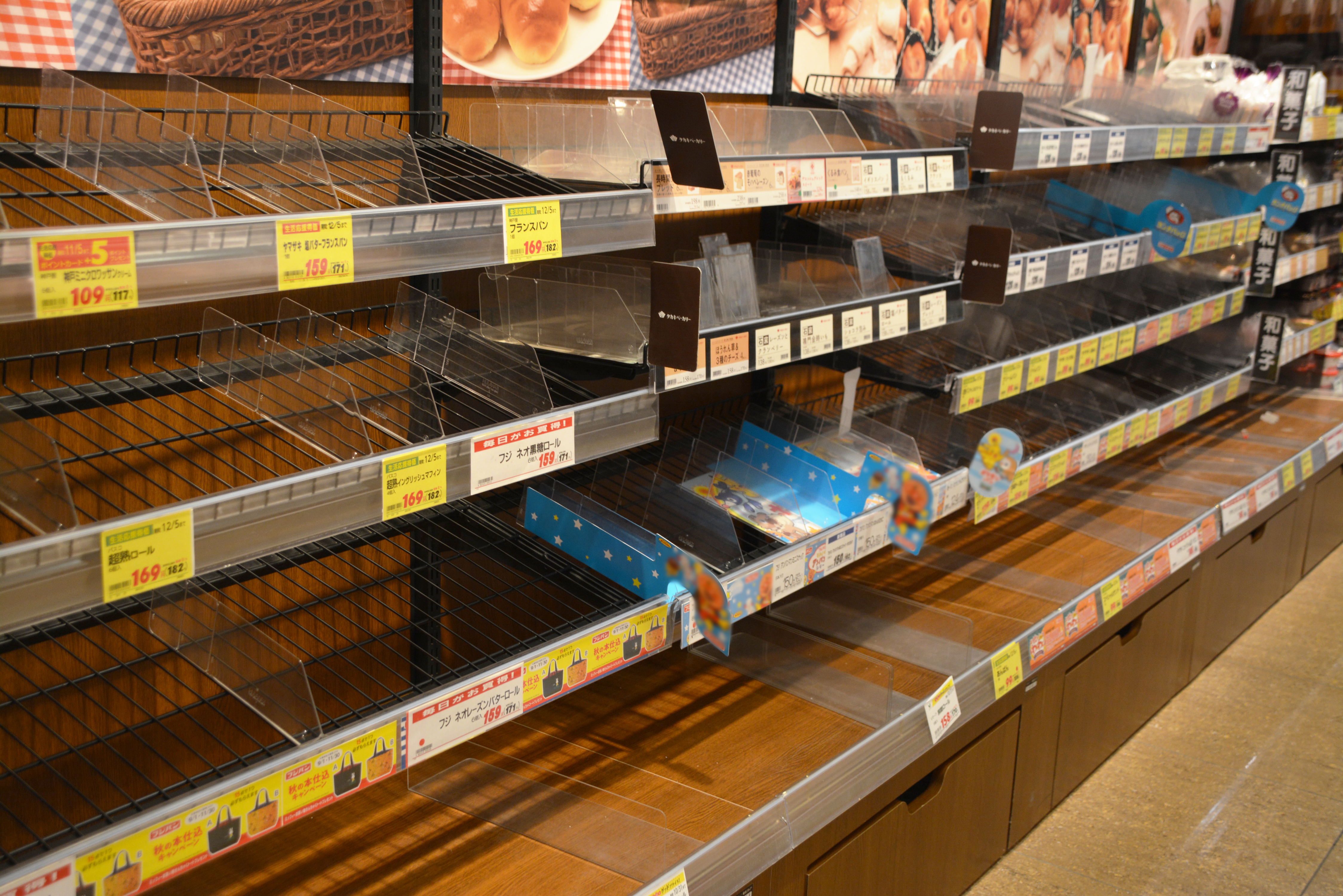 地震災害・備蓄・すっからかん・注意報・警報・避難・在庫・食料品・非常食・飲料水・品薄・スーパーマーケット