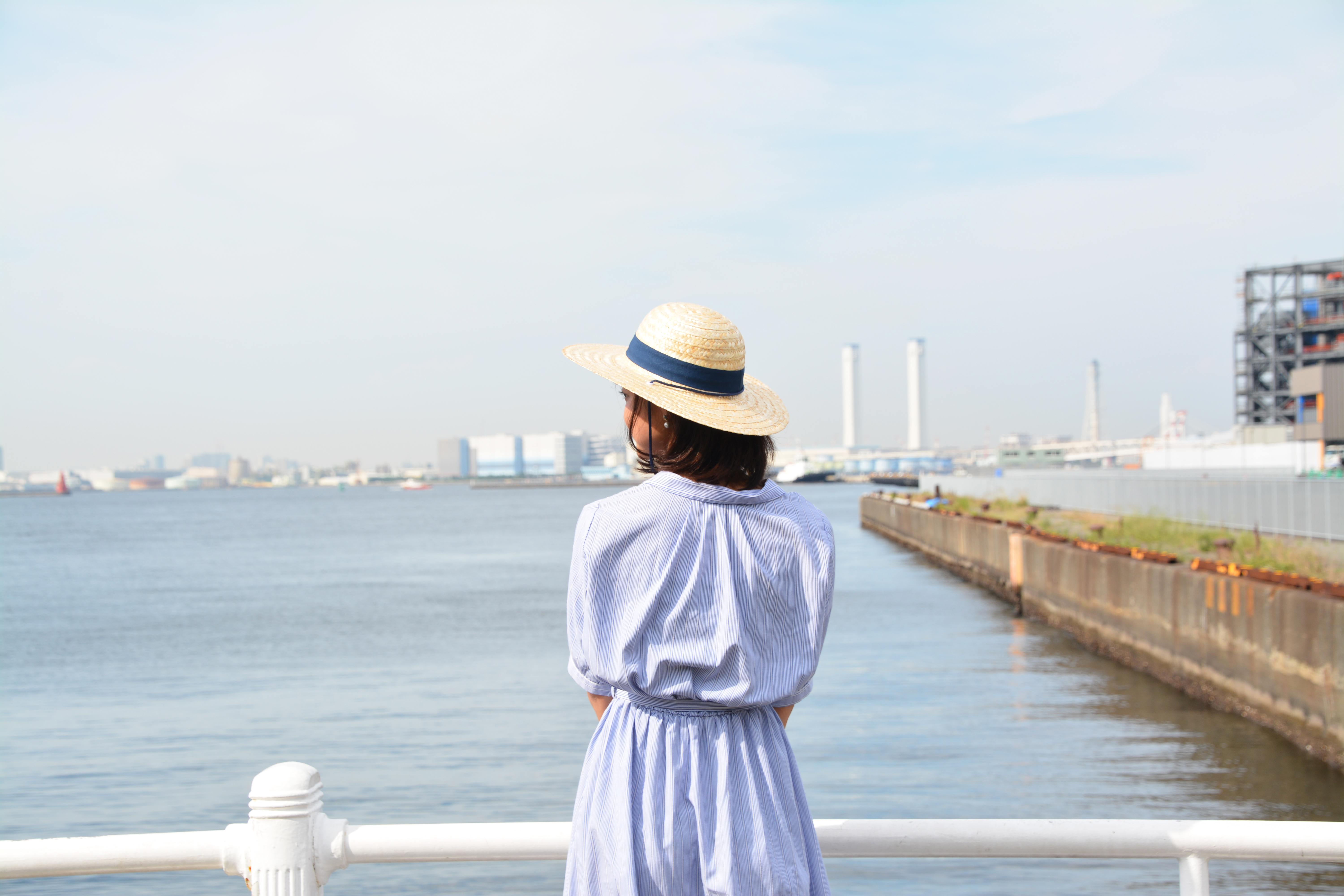 女性・お出かけ・デート・爽やか・女子大生の夏休み・外出・真夏・猛暑・夏日・熱中症対策・日よけ・日焼け・サマー・ひと夏の想い出・少女・海・港・むぎわら帽子