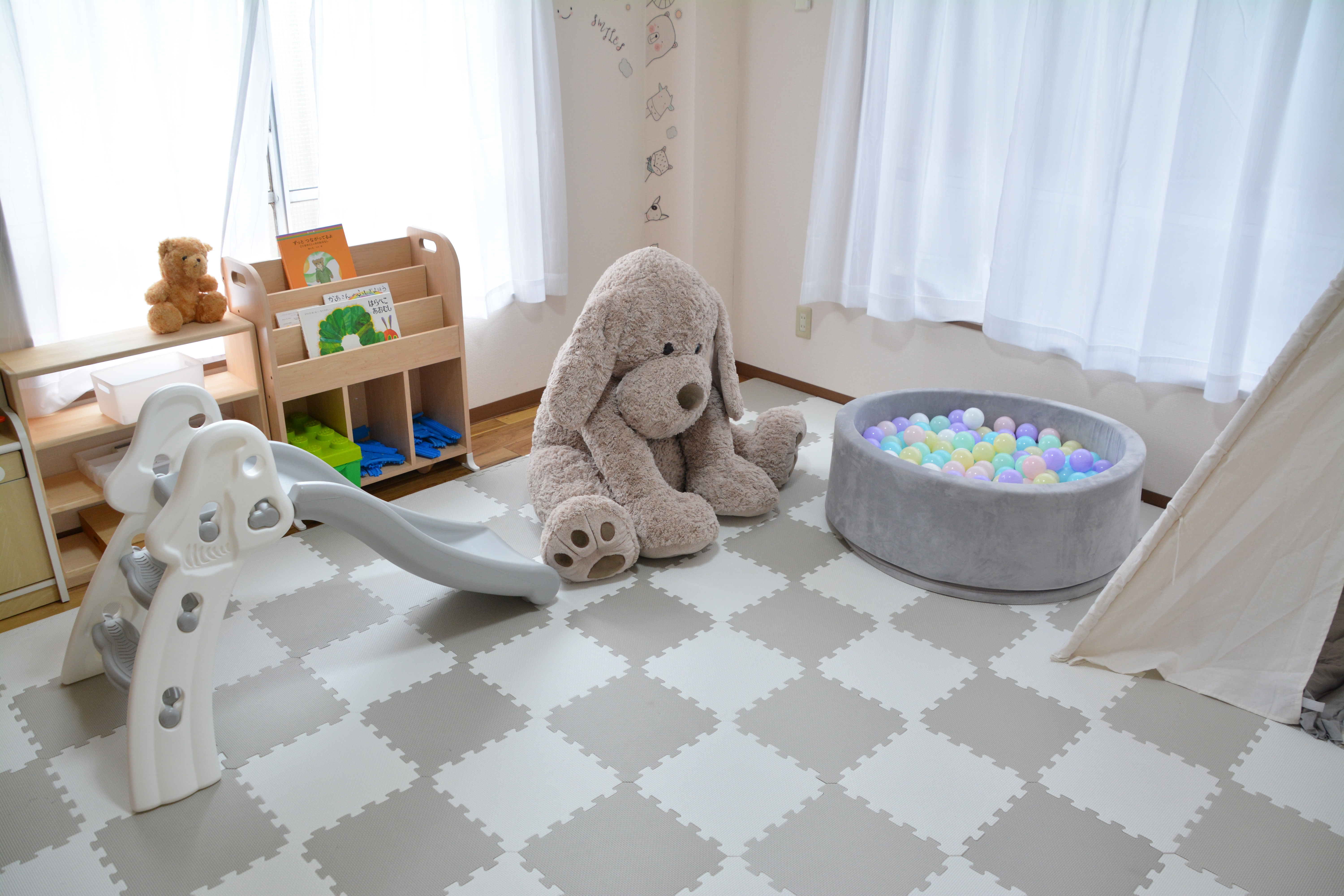 子供部屋・散乱・散らかる・後片付け・子ども・育休・子育て・幼児・断捨離・玩具・オモチャ・おもちゃ・幼児教育・学習・知恵・滑り台・すべり台・室内・片づけ・こども・育児・小窓・カーテン