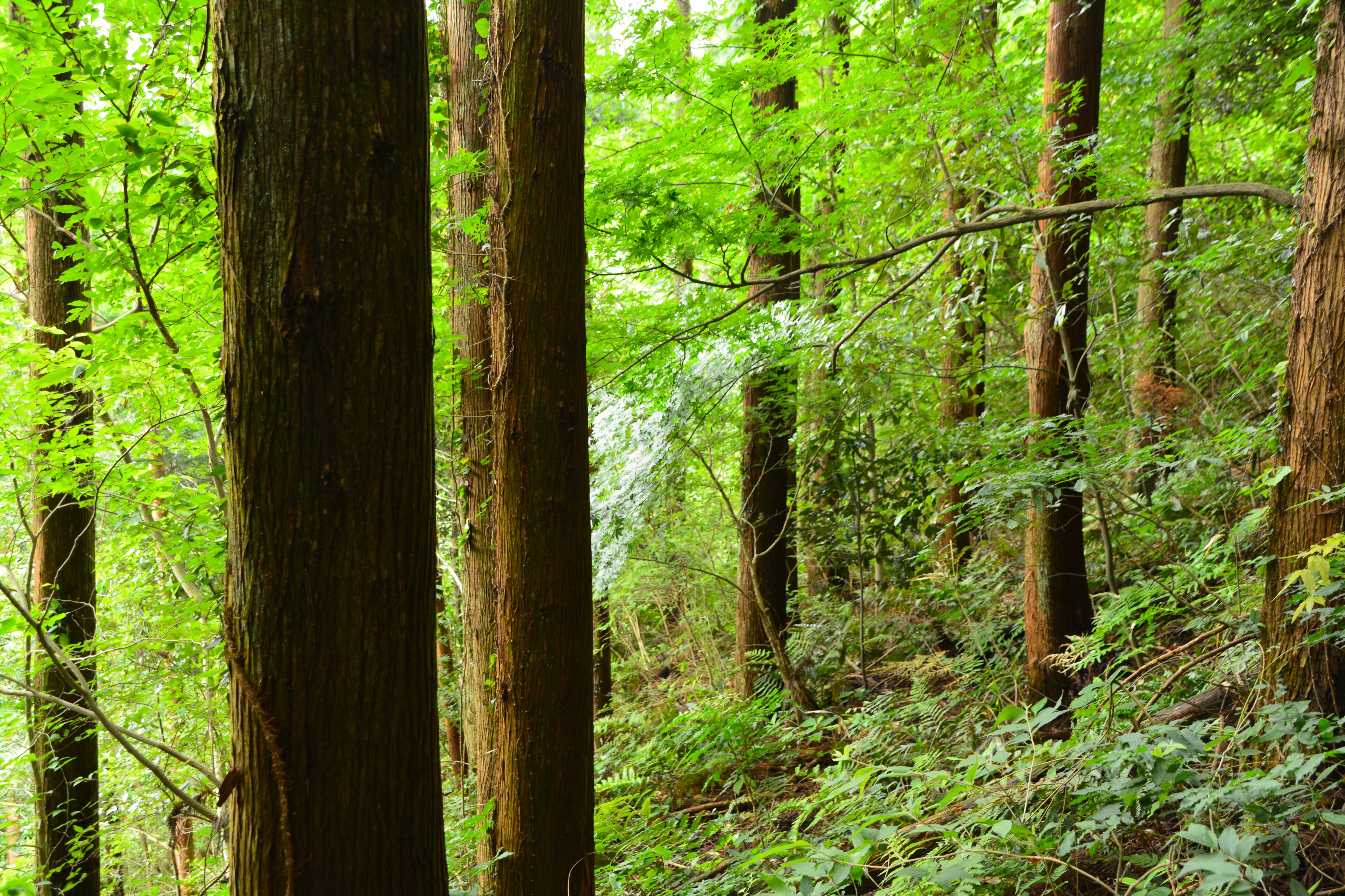 キャンプ・新緑・初夏・山の傾斜・木漏れ日・木々・山林・森林・遭難・山登り・忍者・うっそうとした茂み・鬱蒼としたしげみ・森林浴・マイナスイオン・自然・ナチュラル・山中