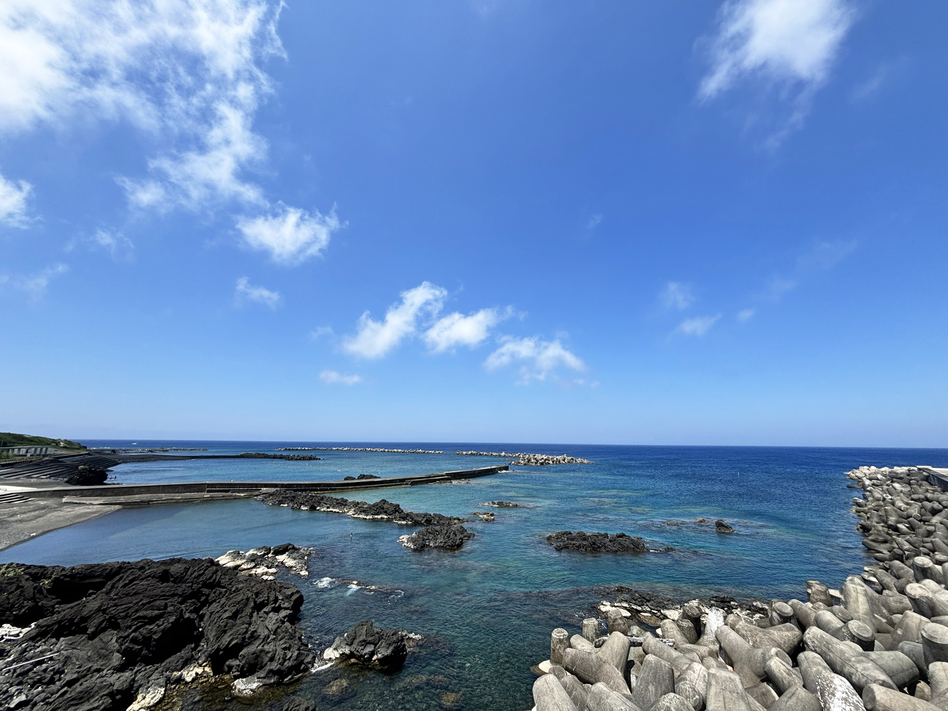 堤防・八丈島(底土港)の海とテトラポット・離岸堤と突堤・海岸線・無人島・左遷・冒険・海と島・半島・離島・岬・青空