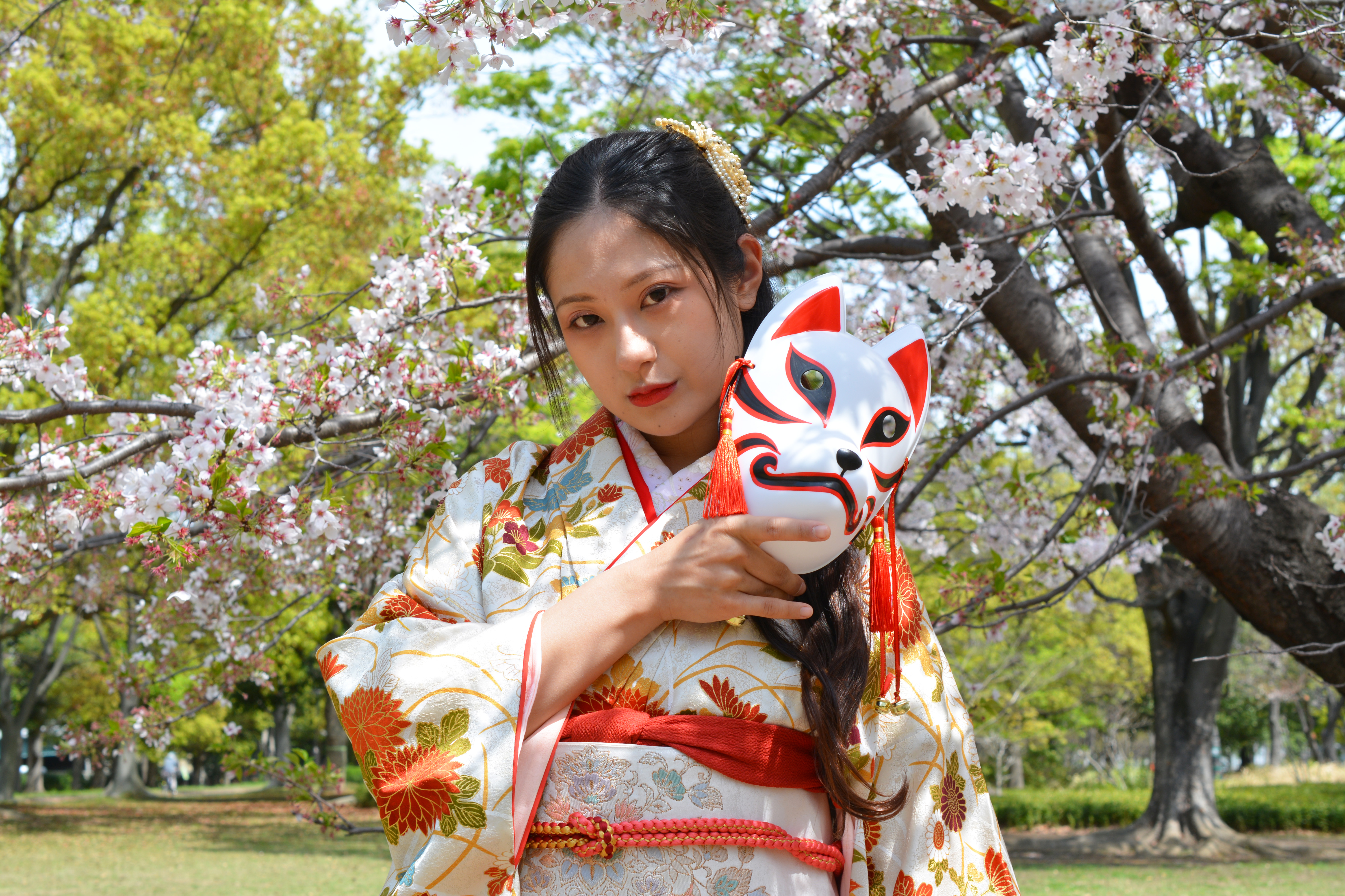 (きつね)キツネのお面・狐の祟り・着物(きもの)・和服・和装・女性・和装・美魔女・コスプレ・江戸時代・時代劇・狐につままれる・騙す(だます)・騙される・不可解・謎・疑問・迷信