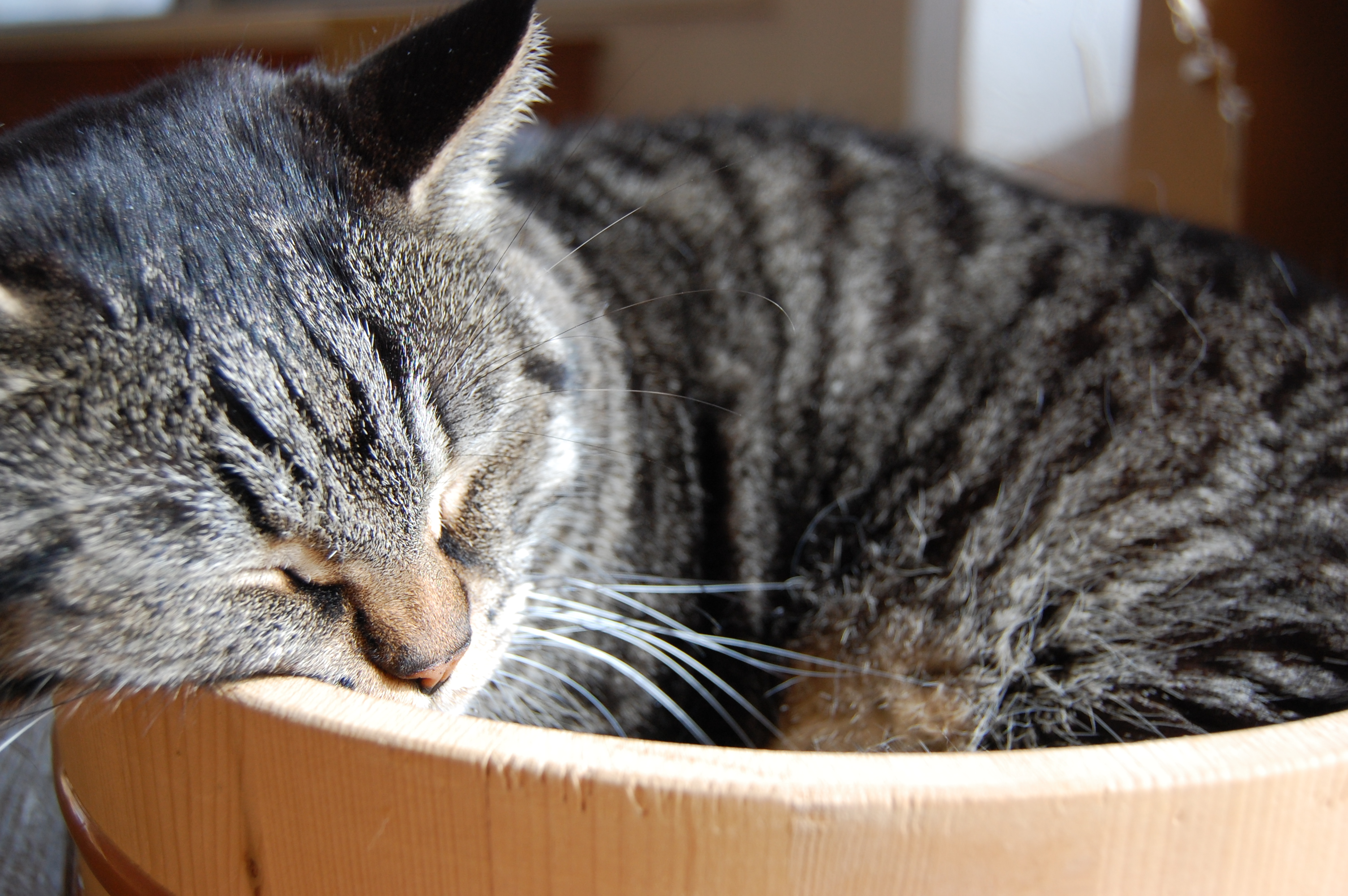 桶に入って、ねこさん気持ちよさそう・ペットホテル・ひなたぼっこ・寝顔・寝相・無視・疲労困憊・疲れ・昼寝・居眠り
