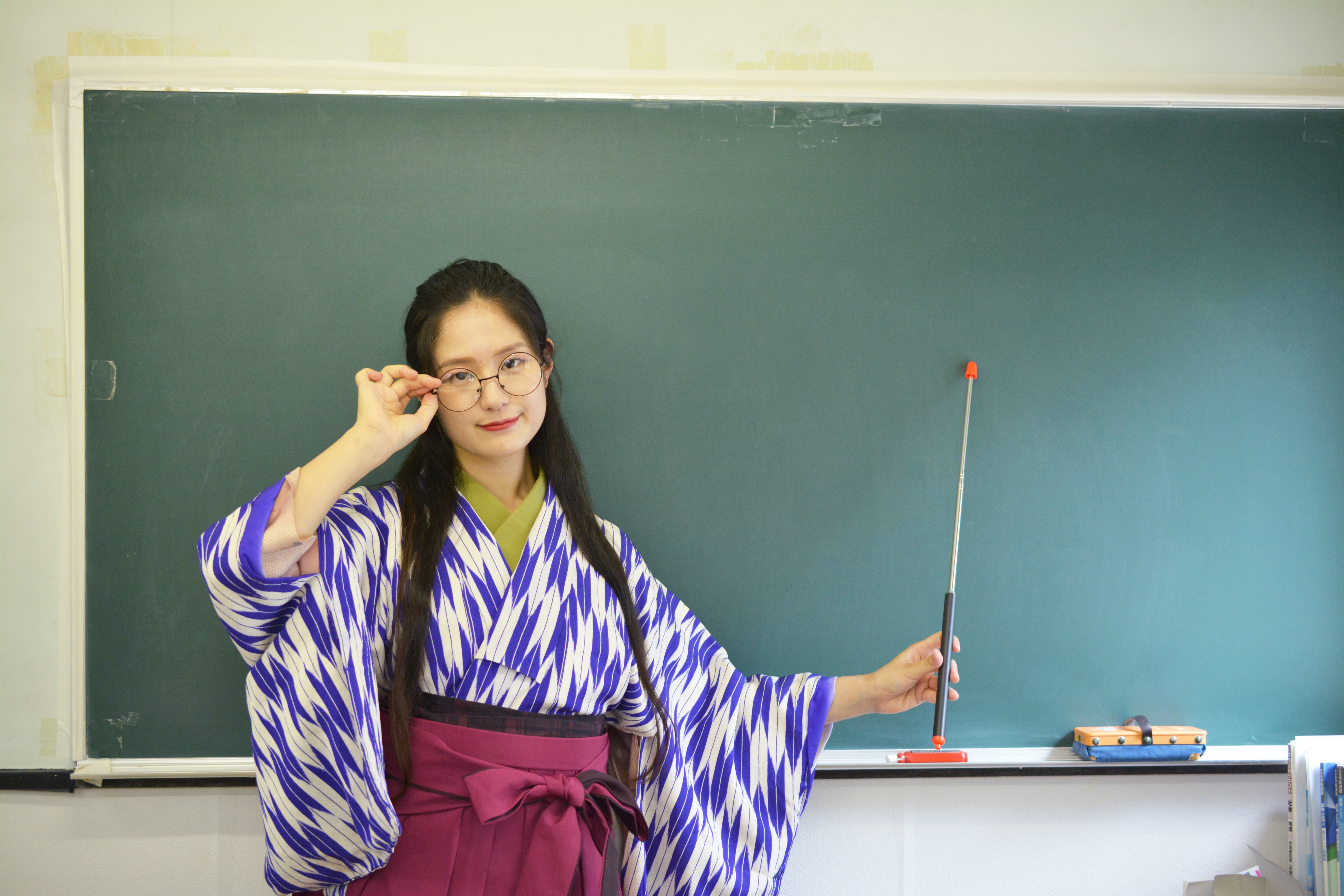 和服・和装・昭和レトロ・古風・勉強・学習塾・黒板・国語・古文・女教師・礼儀・マナー講座・お作法・伝統・歴史・明治・大正ロマン・先生・女子学生・塾講師・文学・小説・指し棒・挿し棒・指示棒・指さし棒