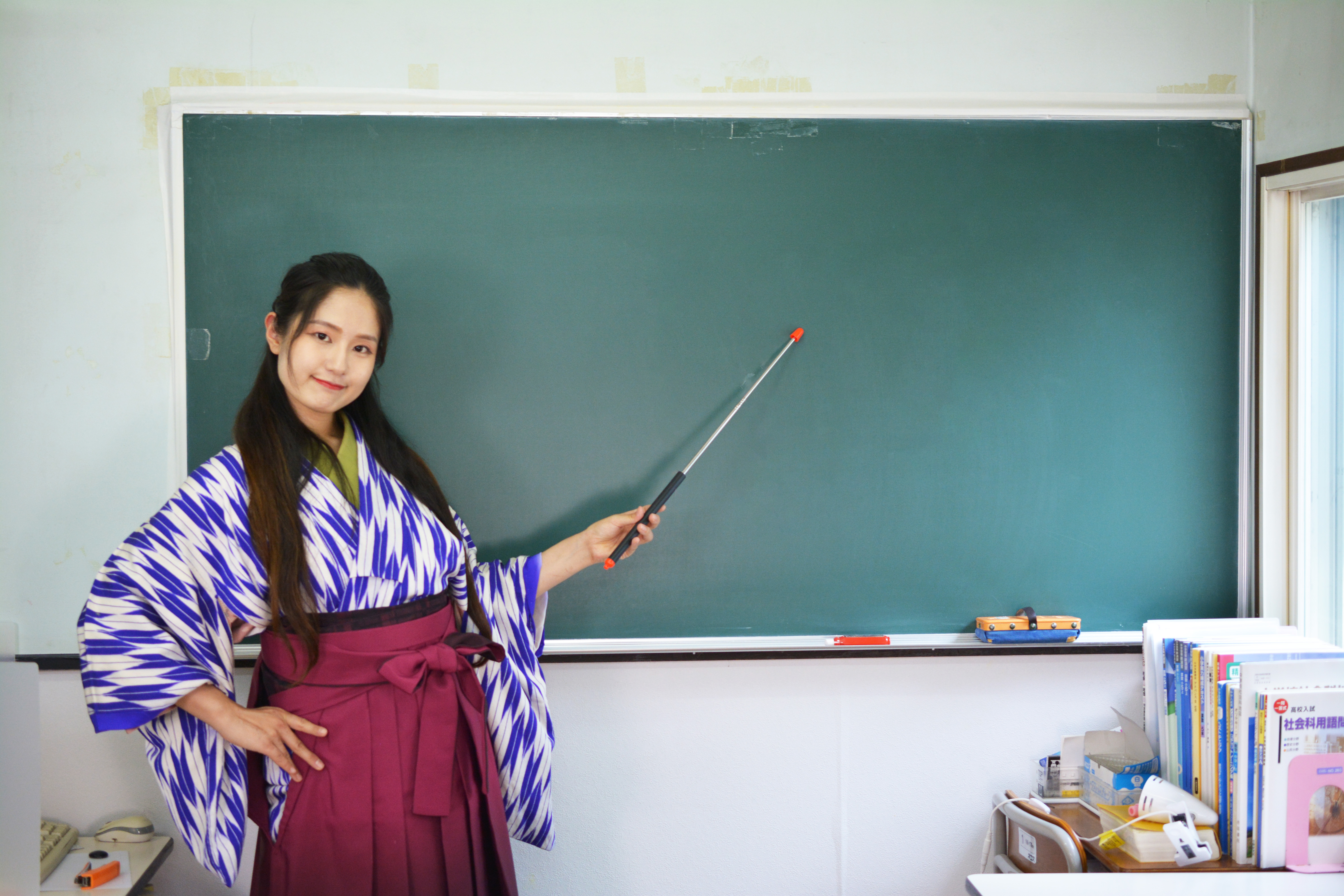 着物女学生・和服・和装・昭和レトロ・古風・勉強・学習塾・黒板・国語・古文・女教師・礼儀・マナー講座・お作法・伝統・歴史・明治・大正ロマン・先生・古典・袴姿・女子学生・塾講師・文学・小説・学校・挿し棒・指示棒・指さし棒