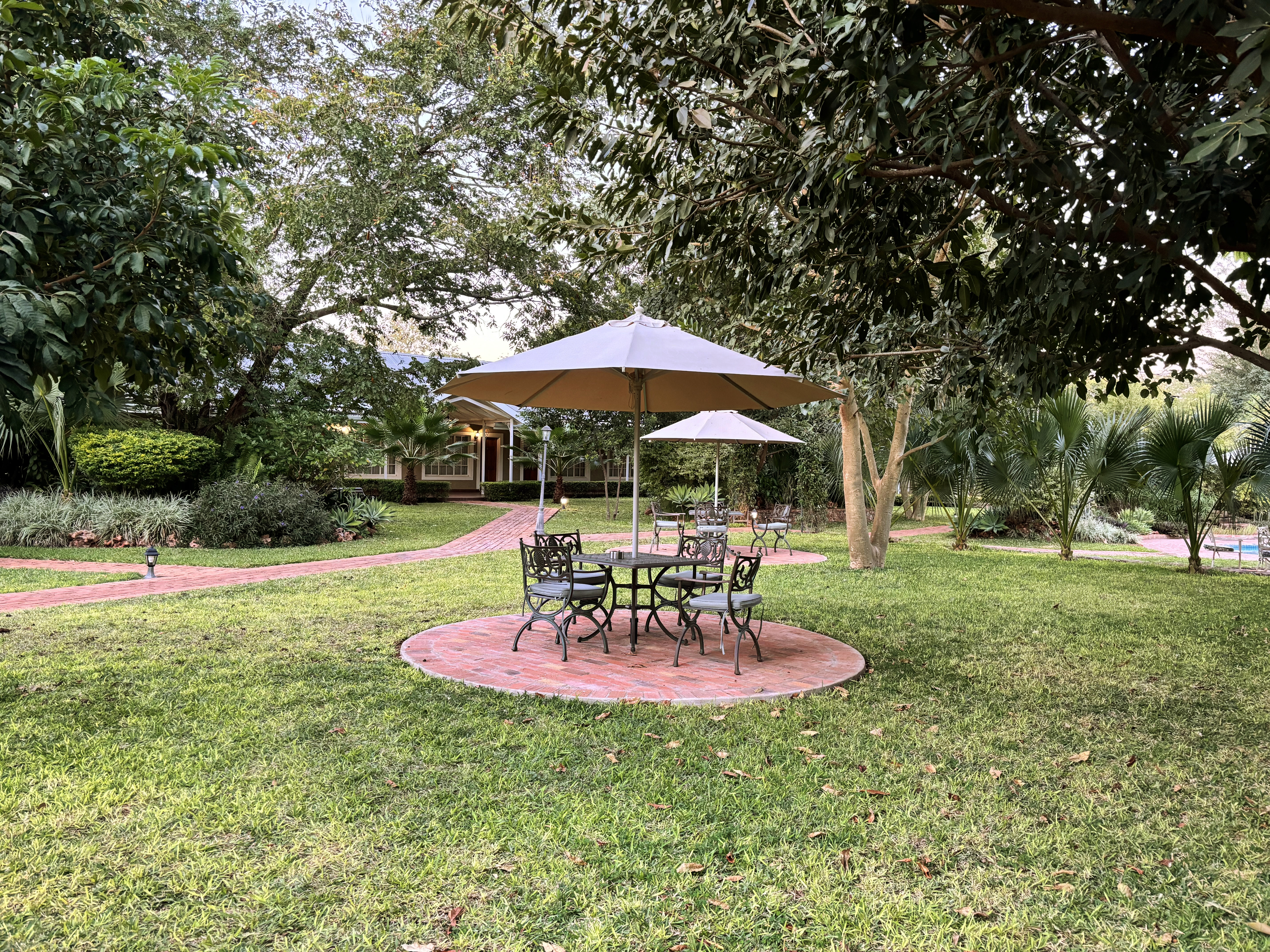 山小屋・宿泊・庭・ガレージ・お洒落カフェ(おしゃれ・オシャレ)・南国・外国・海外旅行・バカンス・新婚旅行・リゾートホテル・夏休み・リラックス・休憩・休息・オープンカフェ・オープンテラス・芝生・お庭・ロッジ・コテージ・日よけ・傘