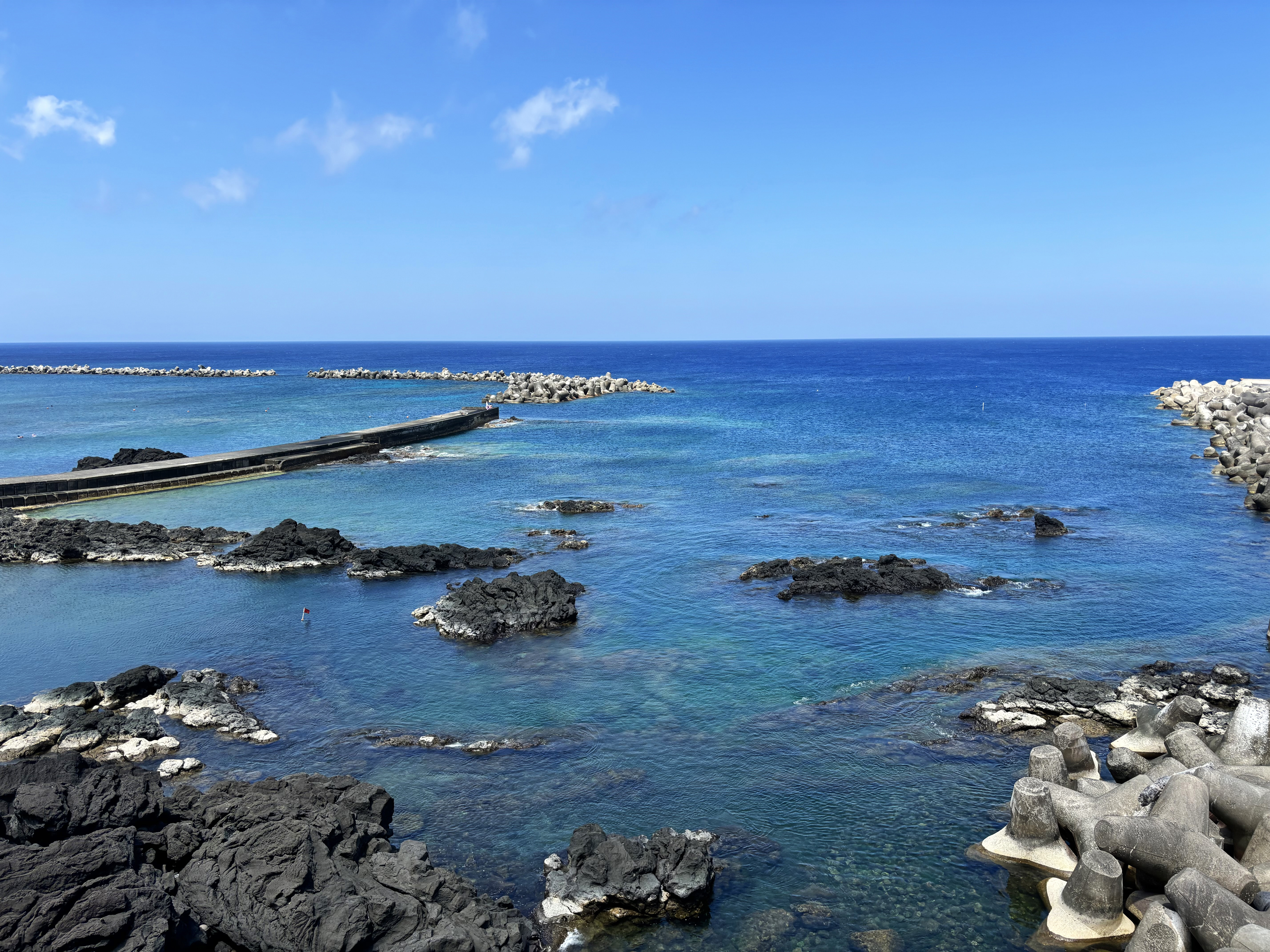 堤防・八丈島(底土港)の海とテトラポット・離岸堤と突堤・海岸線・無人島・左遷・冒険・海と島・半島・離島・岬・青空