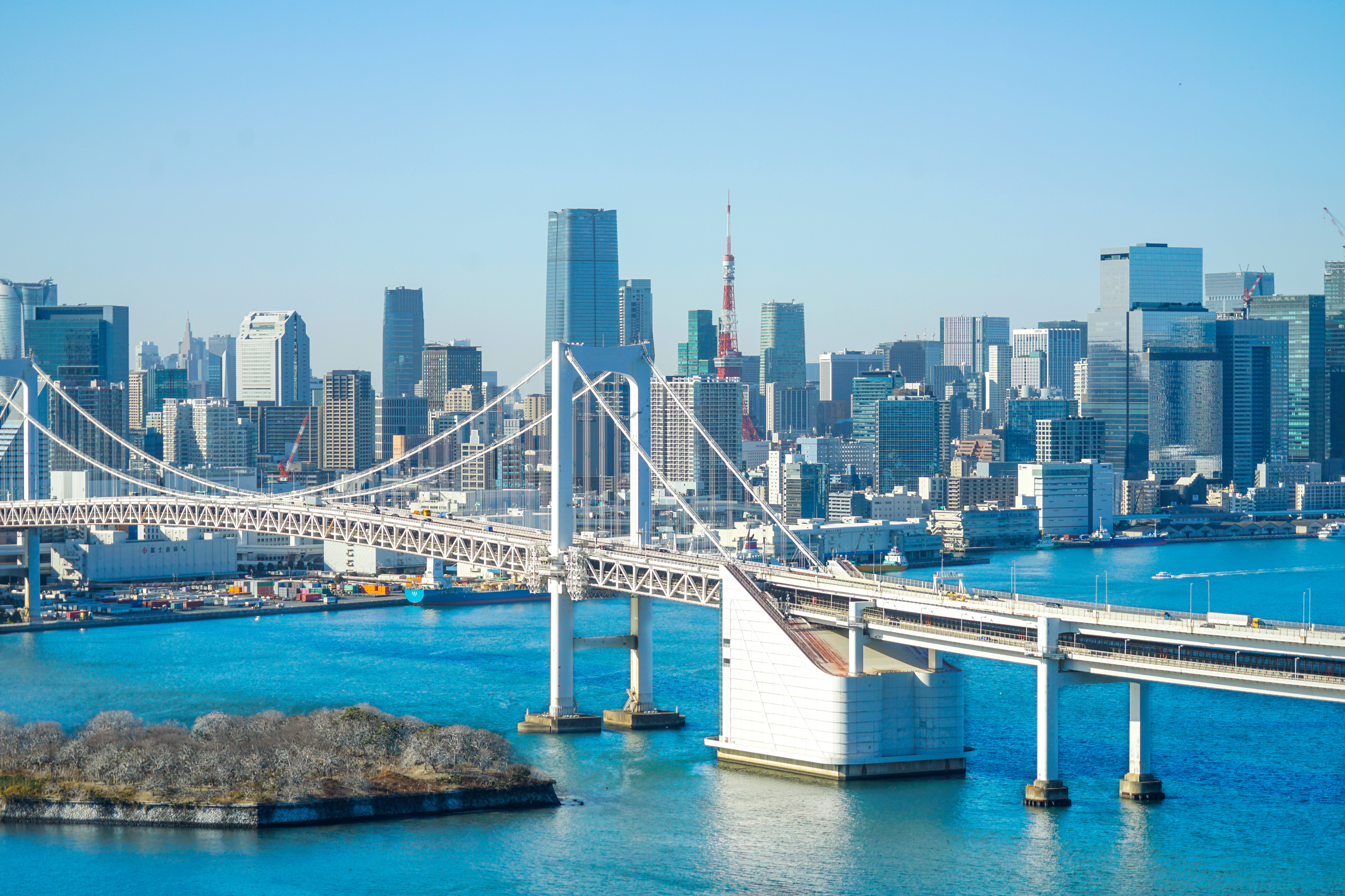 東京都市・ビジネス・都会・橋・見晴らし・景色・眺め・湾岸エリア・お台場・経済成長・吊り橋・快晴・東京タワー