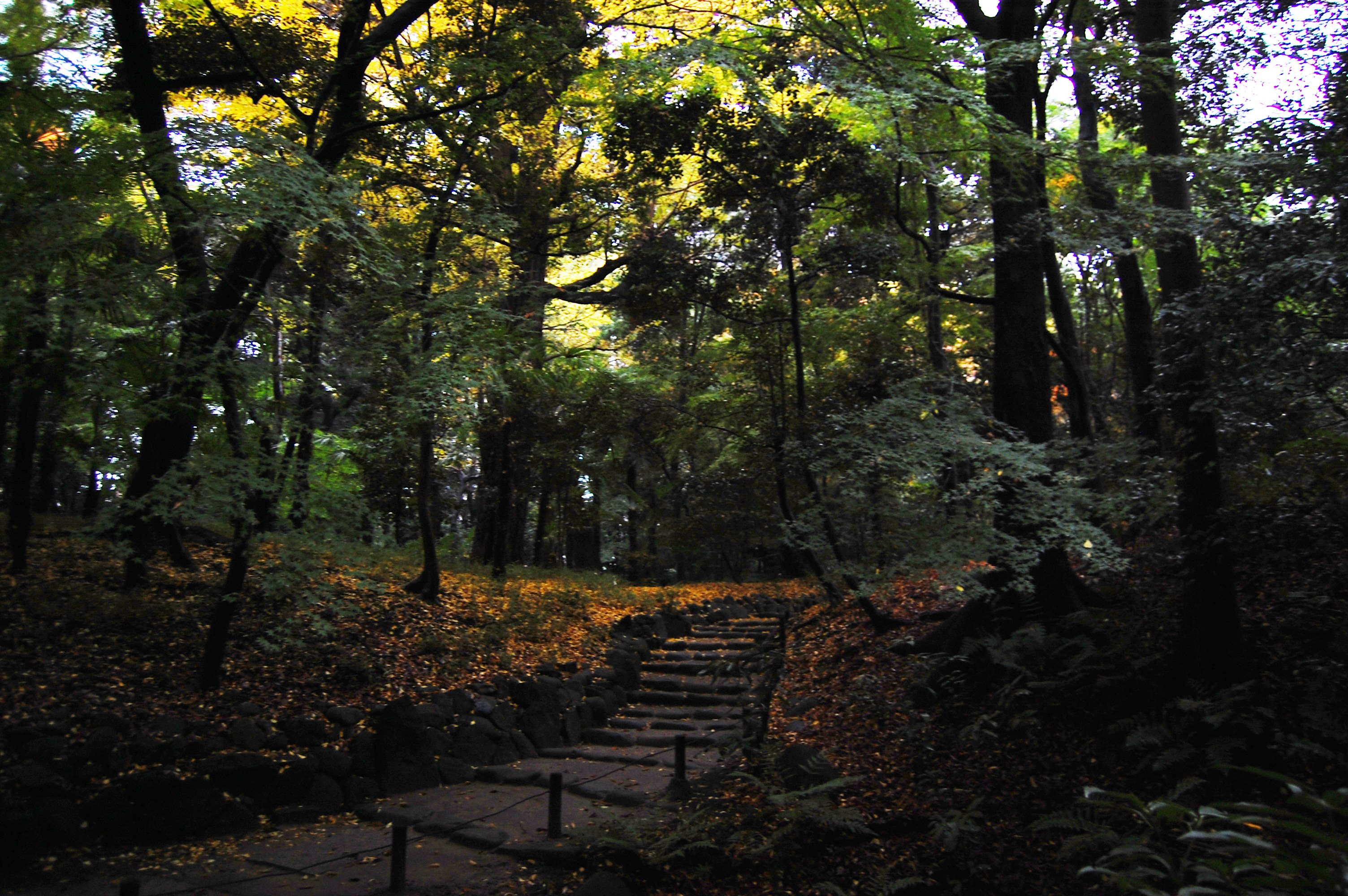 薄暗い・落葉・しめりっけ・風情・陰湿・心霊スポット・パワースポット・忍者・呪文・怨霊・呪い・木々に囲まれる・不思議な魅力・魔力・林道・引寄せ・
