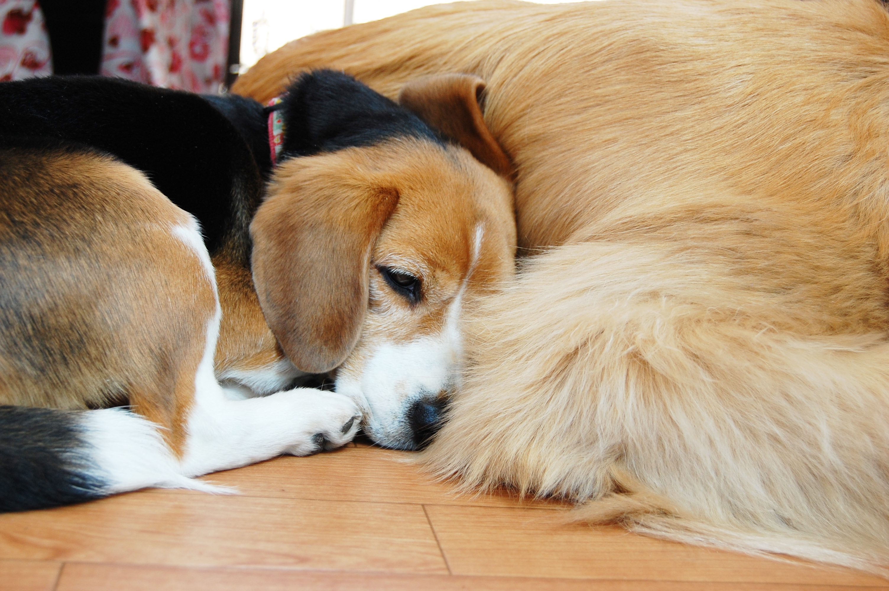 大型犬を枕にして寝る小型犬(ビーグル)3