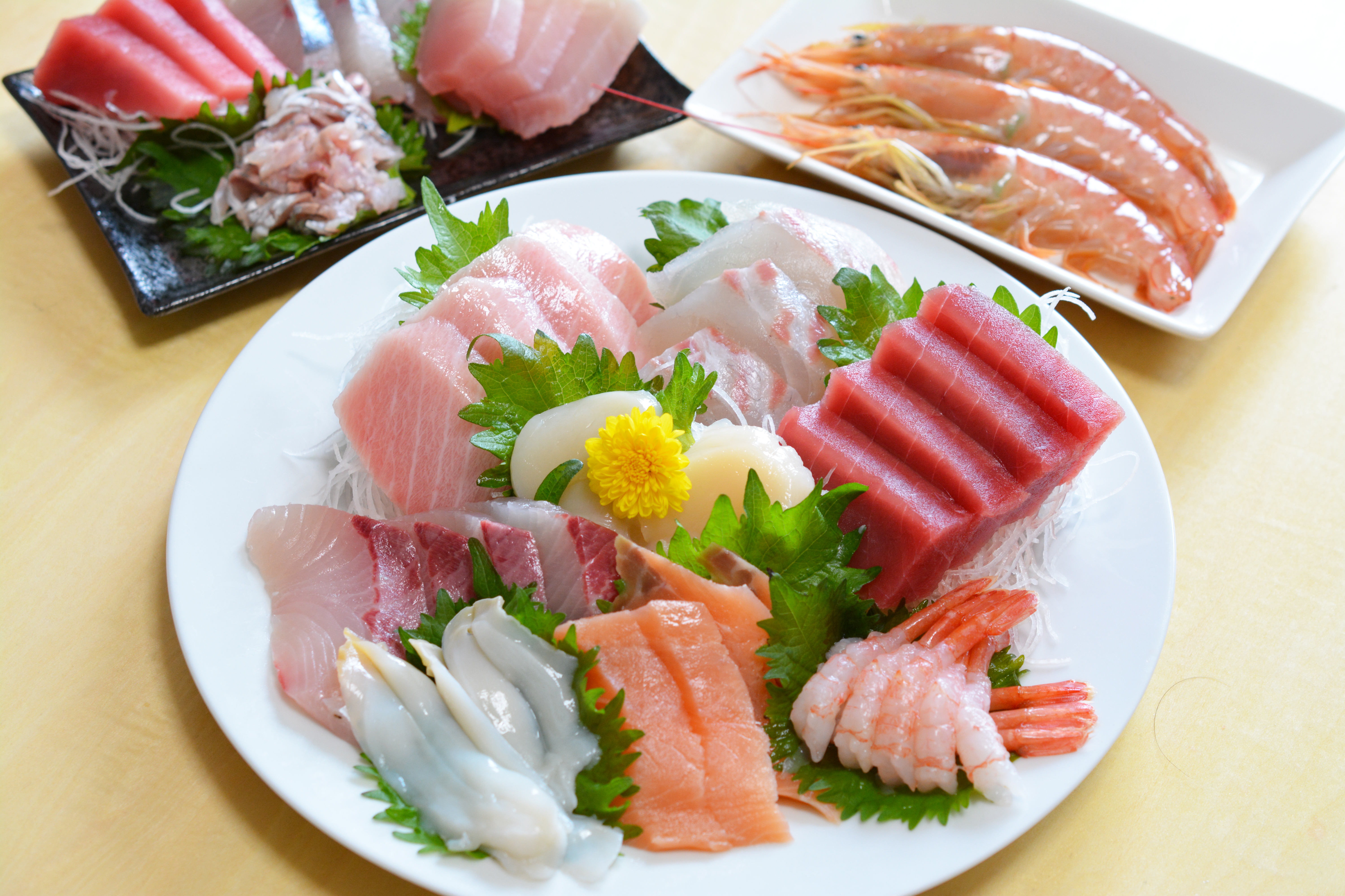 お刺し身の盛り合わせ・刺し盛り・鮮魚・お造り・お刺身の盛り合わせ・ホタテ・真鯛・サーモン・マグロ・甘エビ・甘えび