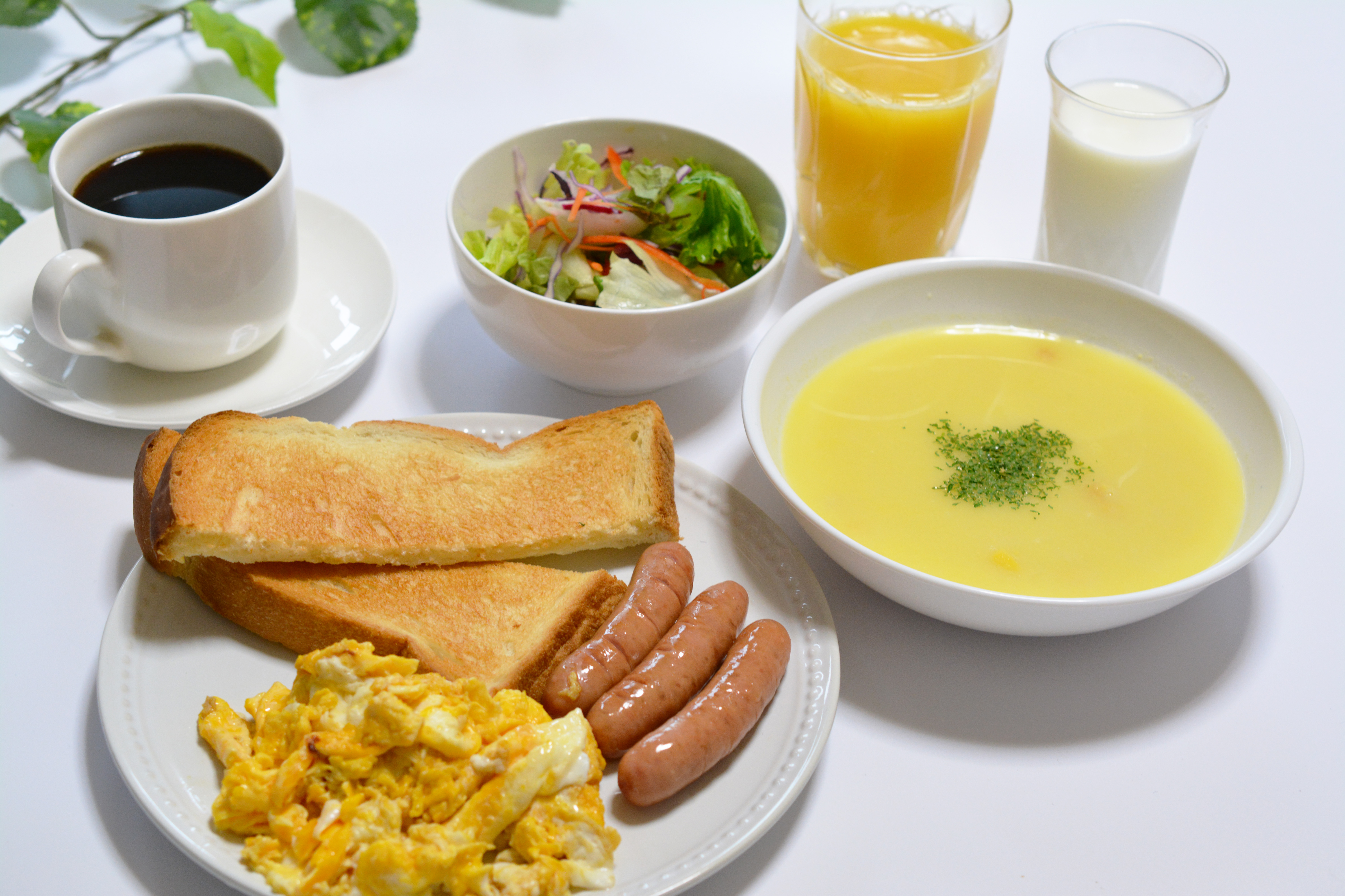 コーンポタージュ・朝食・オレンジジュース・牛乳・コーヒー・食パン・スクランブルエッグ・サラダ・ウィンナー・ソーセージ・ミルク・モーニング・ウインナー