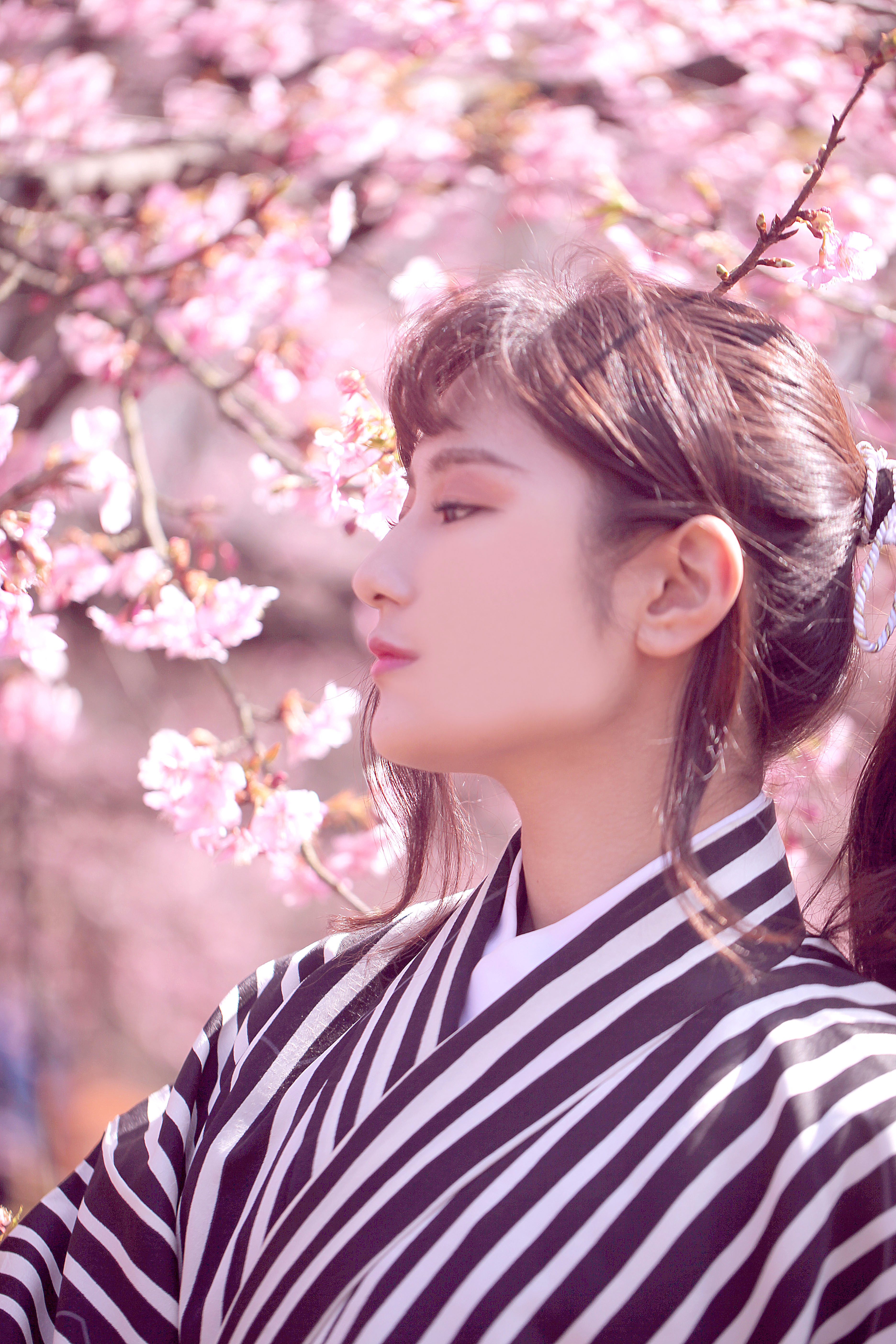 春・桜・着物・さくら・サクラ・和風・女性・和服美人・大和撫子・やまとなでしこ・きもの・和装・美女・美魔女・コスプレ・江戸時代・時代劇・覚悟・凛々しい目・瞳・扇子・センス・流し目・見つめる・見上げる・考える・考え事・物思いにふける・お花見・恋愛・失恋・恋心・乙女心