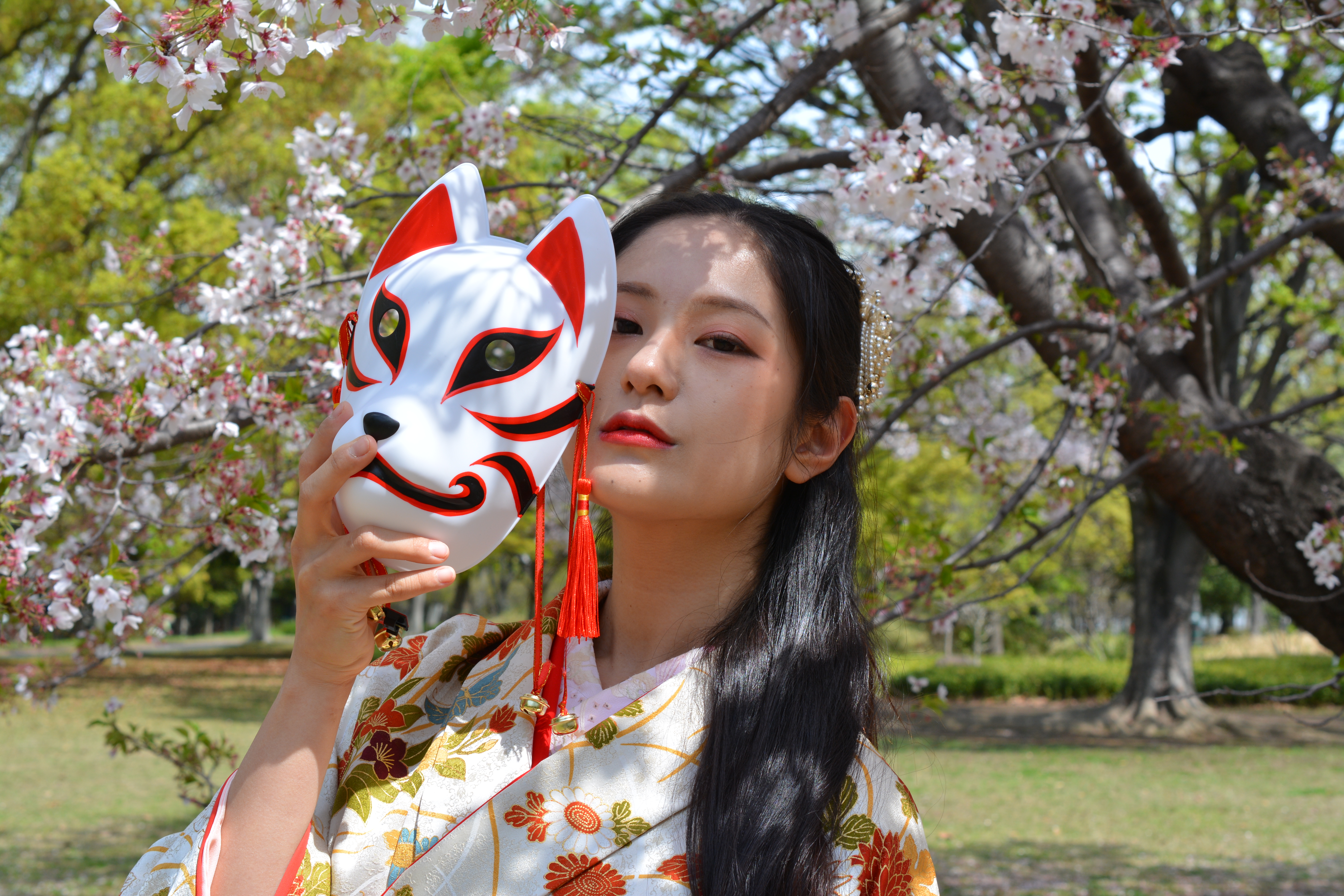 (きつね)キツネのお面・狐の祟り・着物(きもの)・和服・和装・女性・和装・美魔女・コスプレ・江戸時代・時代劇・狐につままれる・騙す(だます)・騙される・不可解・謎・疑問・迷信・不思議・化ける
