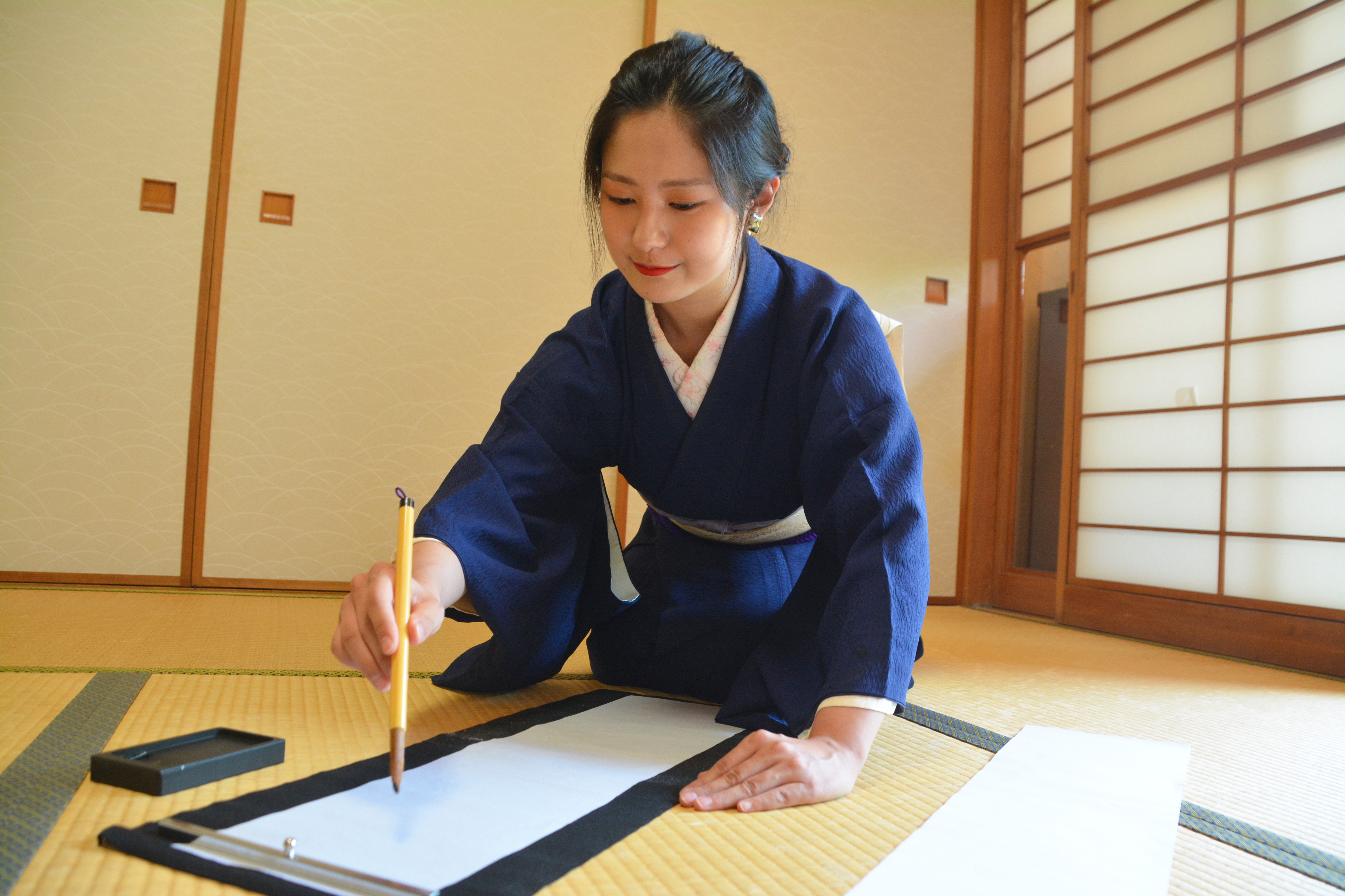 硯・墨汁・筆・文字・毛筆・習字・師匠・和服・和装・着物・書道家
