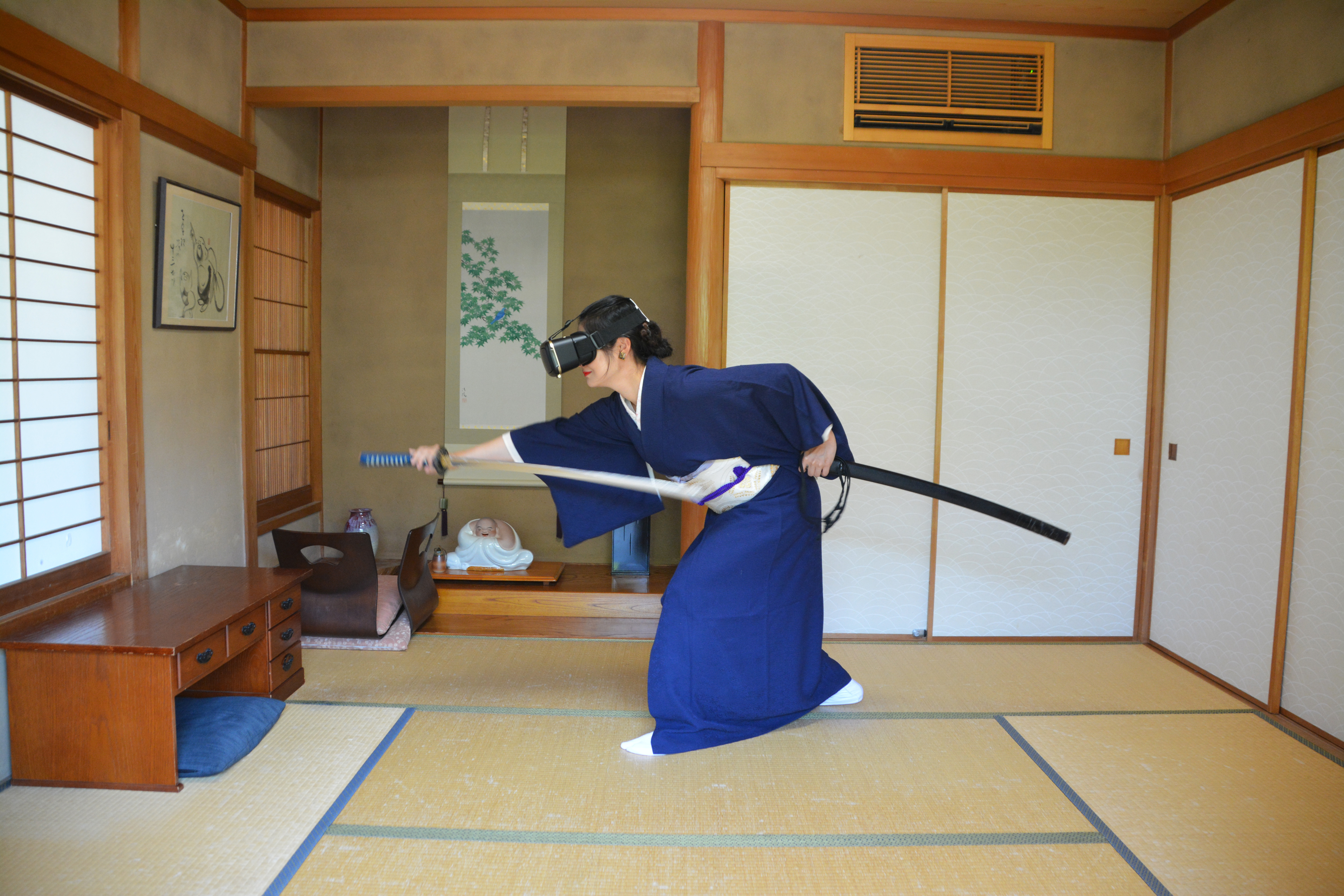 vrゴーグル・バーチャルリアリティー・空想・架空の世界・幻想・仮想現実・現実逃避・和室・着物・和服・和装・女将・女性・日本刀・殺陣・ちゃんばら(チャンバラ)・剣
