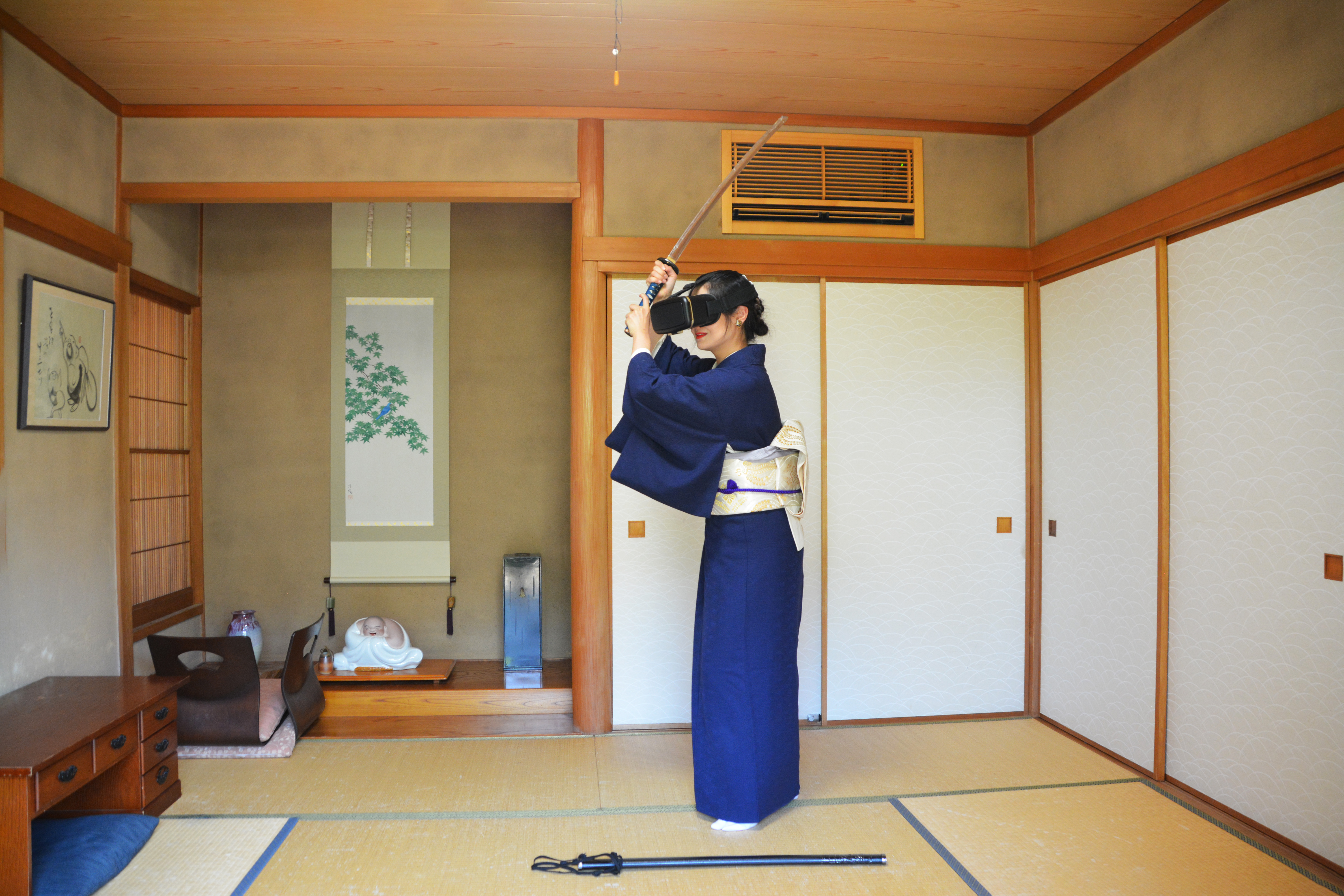 vrゴーグル・バーチャルリアリティー・空想・架空の世界・幻想・仮想現実・現実逃避・和室・着物・和服・和装・女将・女性・日本刀・殺陣・ちゃんばら(チャンバラ)・剣